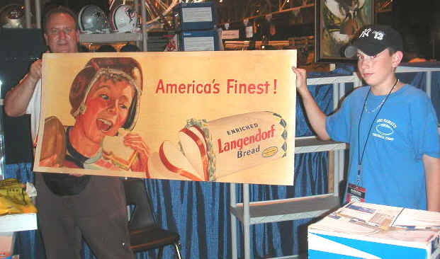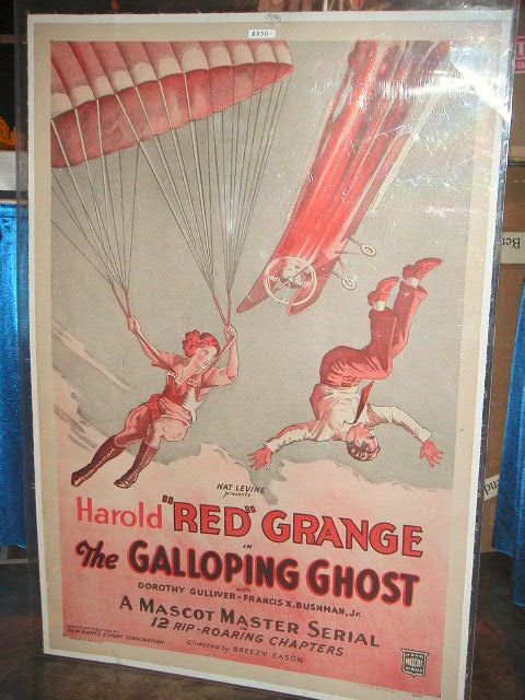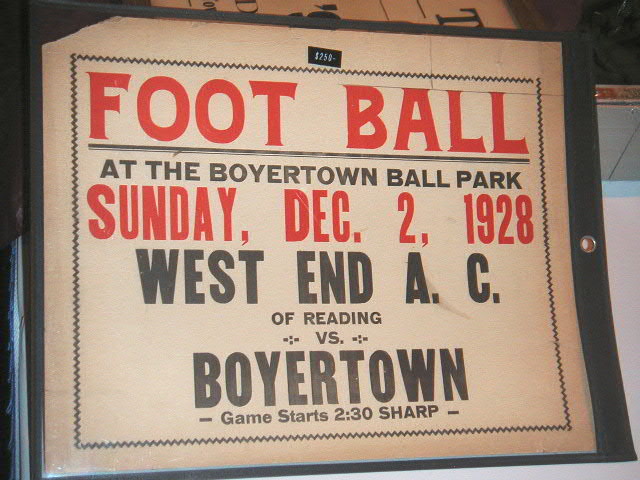 We begin with the booth of Steven Galletta who came from the New York City area. Steven brought a nice, large, 1930’s generic advertising sign for Langendorf Bread, showing a boy wearing a leather football helmet, 50” wide by 23 ˝” tall, $400.00, Cool sign, sold opening day. Next Galletta piece, a very nice one sheet movie poster with Red Grange starring in “The Galloping Ghost”, 27 3/8” wide by 40 ľ” tall, $950.00, fairly rare, classic must have for a Grange collector. Next, Galletta had a nice 1928 football broadside game poster for the West End Athletic Club of Reading vs. Boyertown, nice little poster, note “foot ball” in two words, 14” wide by 11” tall, $250.00 .