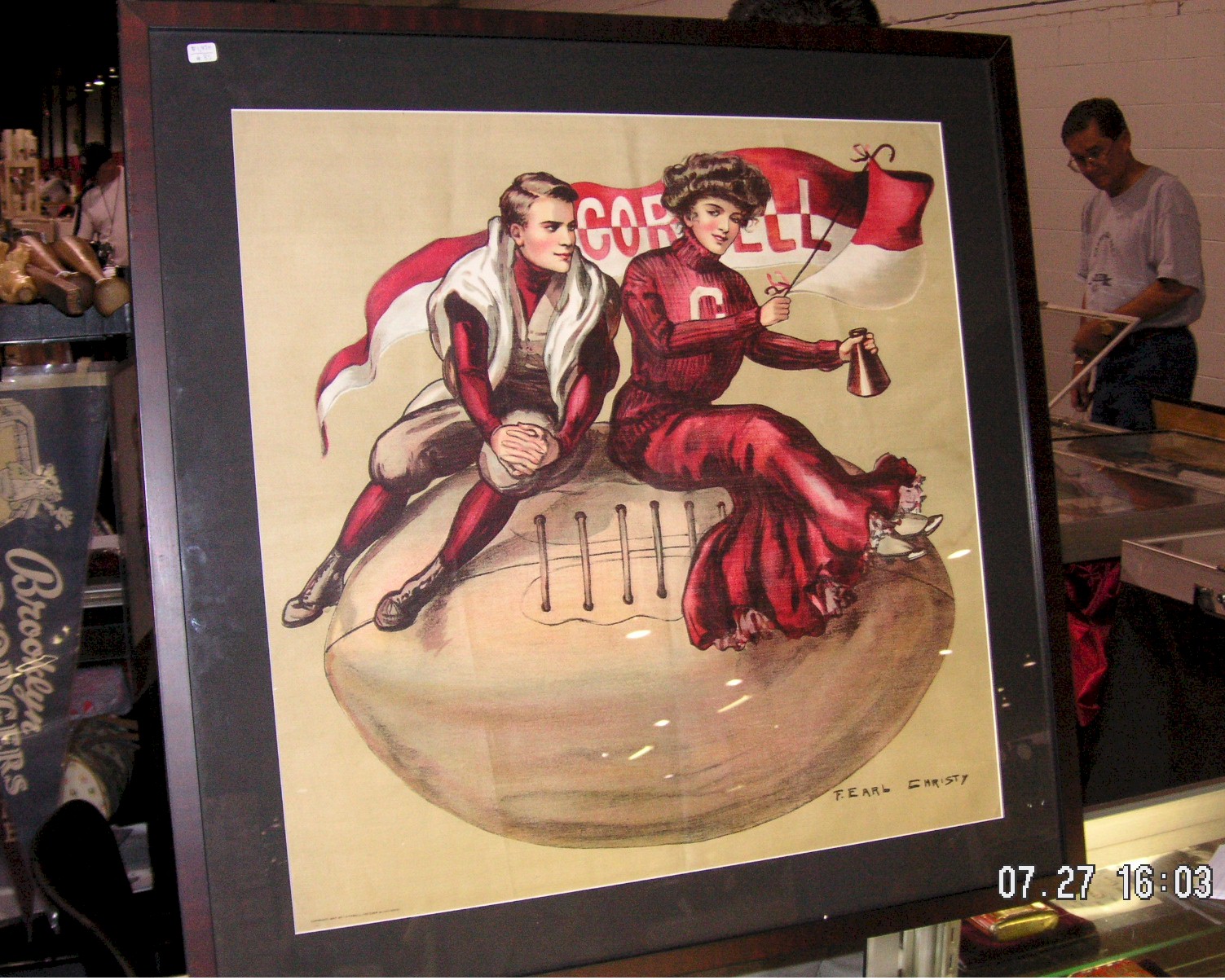 real nice 1907 framed pillow cover with a Cornell Football player sitting on a huge football next to a victorian girl, 22” by 22” $1,450.00. It was not only great looking, but interesting for a couple of reasons. First it was dated 1907 in the corner. I’d never seen one of these Victorian sports pillow covers that was dated. Second, it was prominently signed by F. Earl Christy. F. Earl Christy was probably the most prominent illustrator of these kinds of collegiate sport depictions. You see