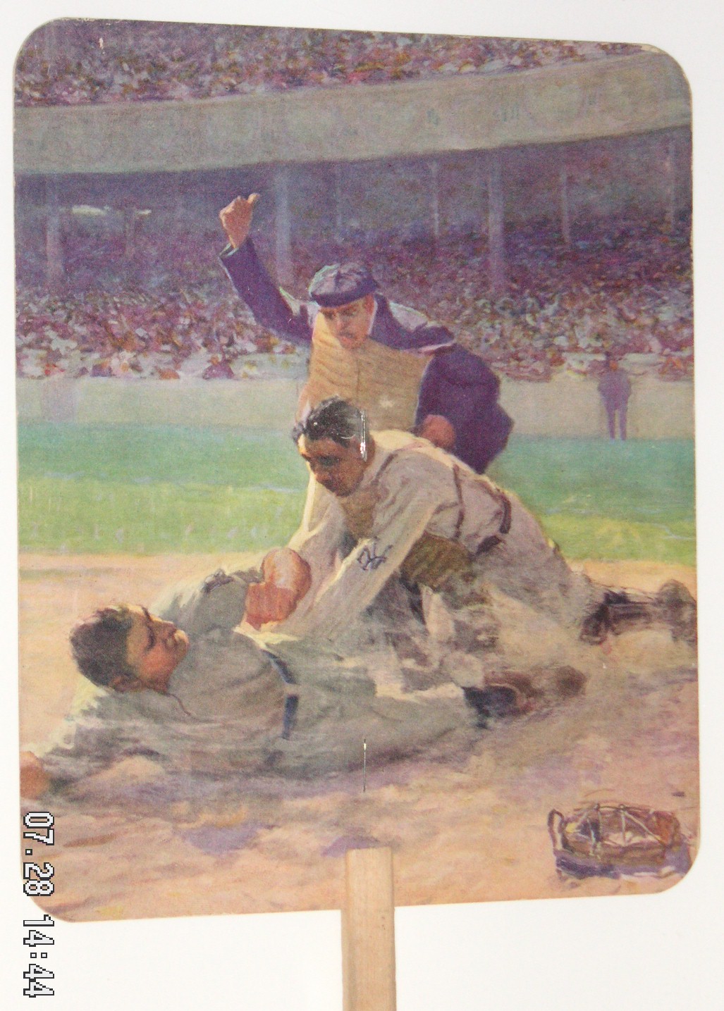 sliding into base, being tagged out by Chief Meyers of the New York Giants, really nice condition, 14” tall by 7” wide, paid $150.00