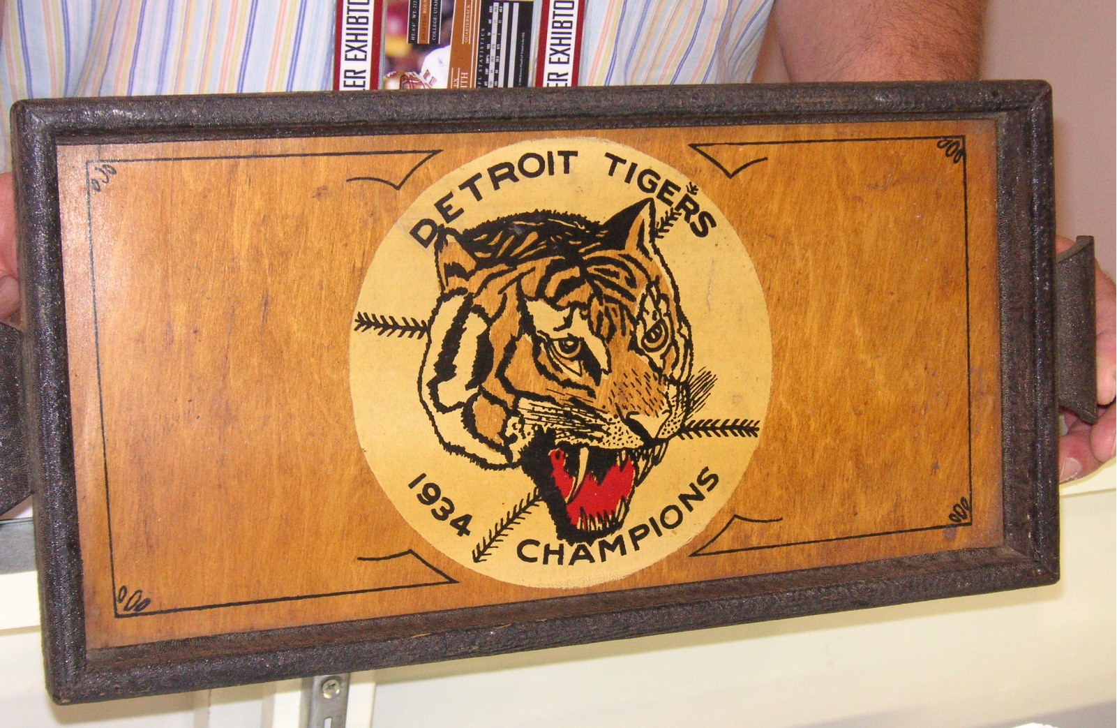 Next up Bryan had a great Detroit Tigers wooden serving tray picturing a tiger protruding from a large baseball with the date 1934, really nice condition, 14 ½” x 7 ½” , $795.00. Next Bryan had a nice