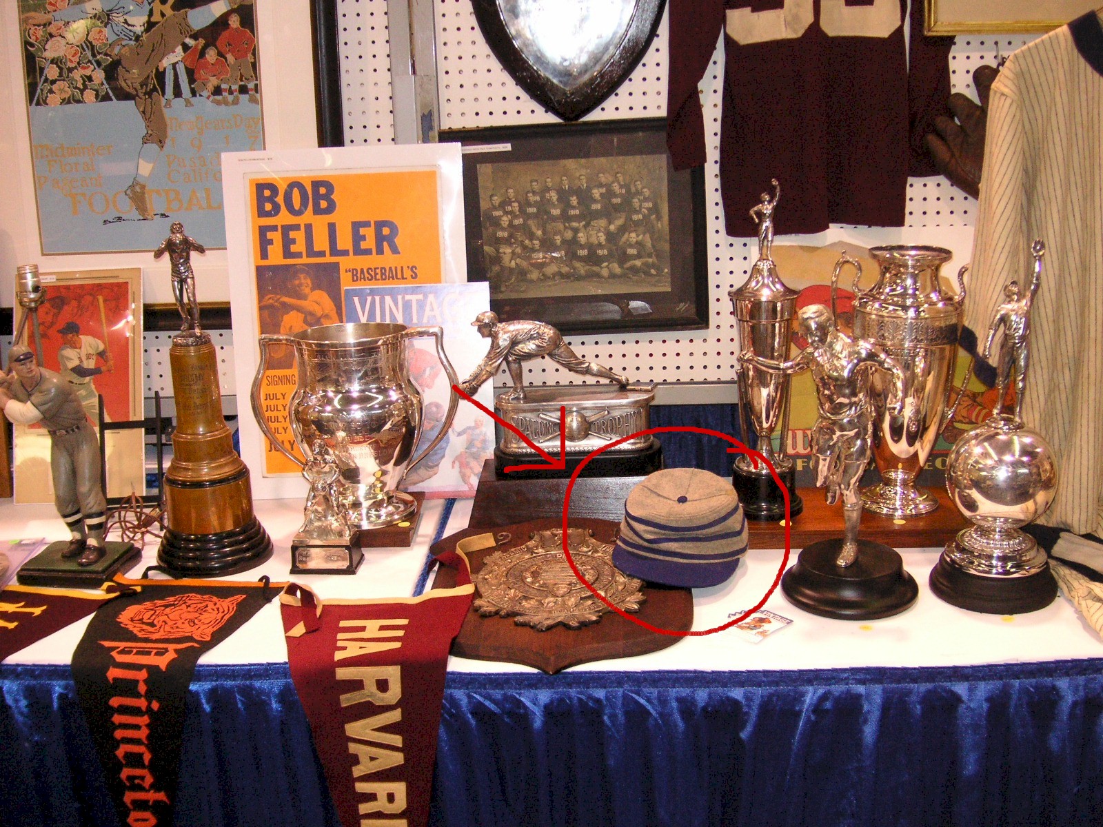 Next John had a large 26 inch figural of a baseball player wearing an All Star type uniform. It was some kind advertising piece I believe, perhaps from a sporting goods store, and appeared to be made of some kind of wood composition material. I think John had it on consignment for someone, $4,200.00. Concluding our journey over the great plains of the Kanuit Griffith booth we come to a large and impressive baseball trophy made by Rogers Brothers. It had an elaborate and detailed engraving of a baseball game in progress, under the top rim. The presentation engraving on the front read: Donated to Menorah Lodge 144OOF in memory of Mrs. Aaron Breslow, unquote, 24” tall, $3,200.00. When I review the Kanuit Griffith booth photos now I see things I’m puzzled by, that I didn’t take notes on. Like that pillbox cap for instance. Future Nationals, no more unforeseen circumstances.