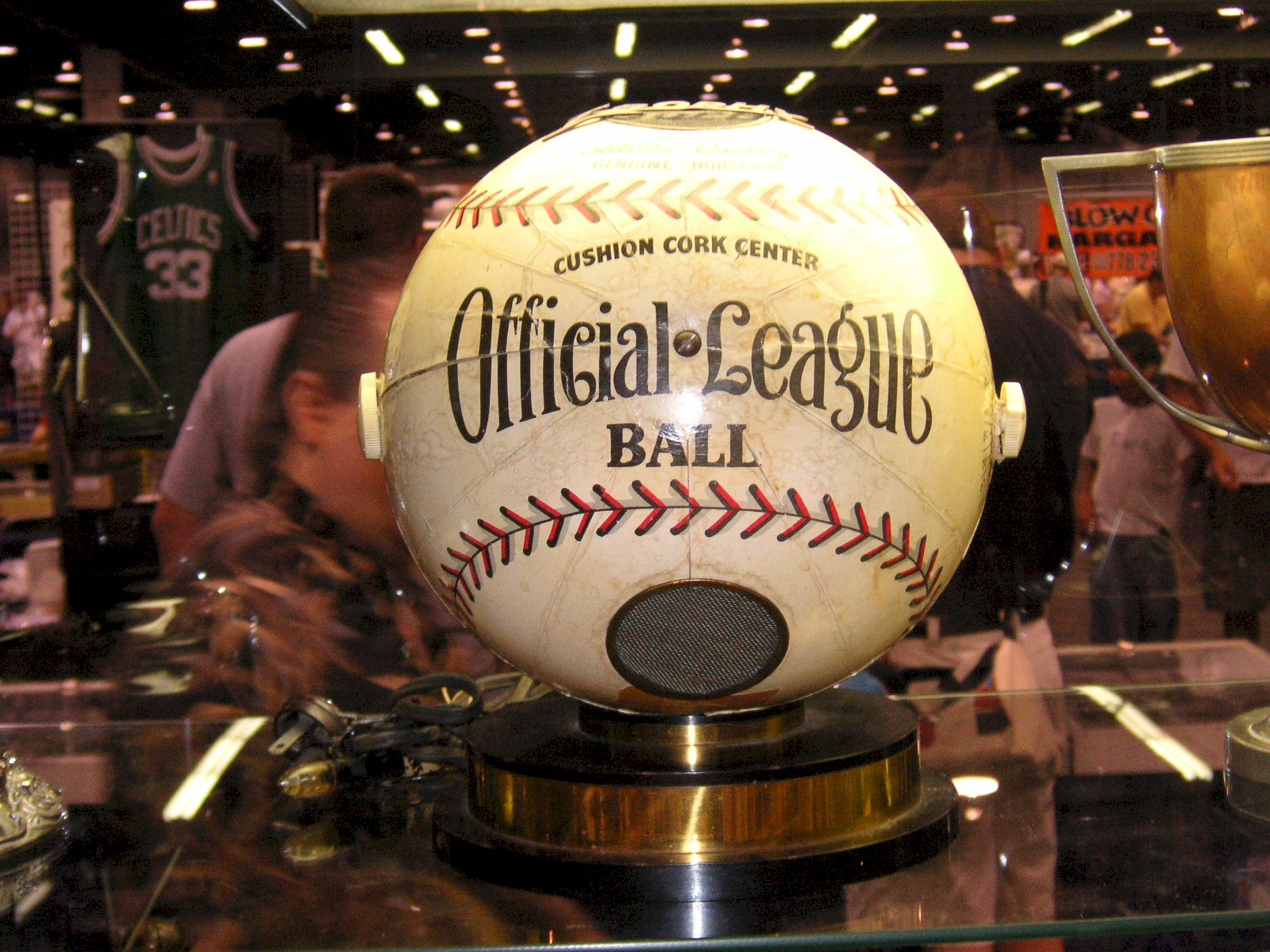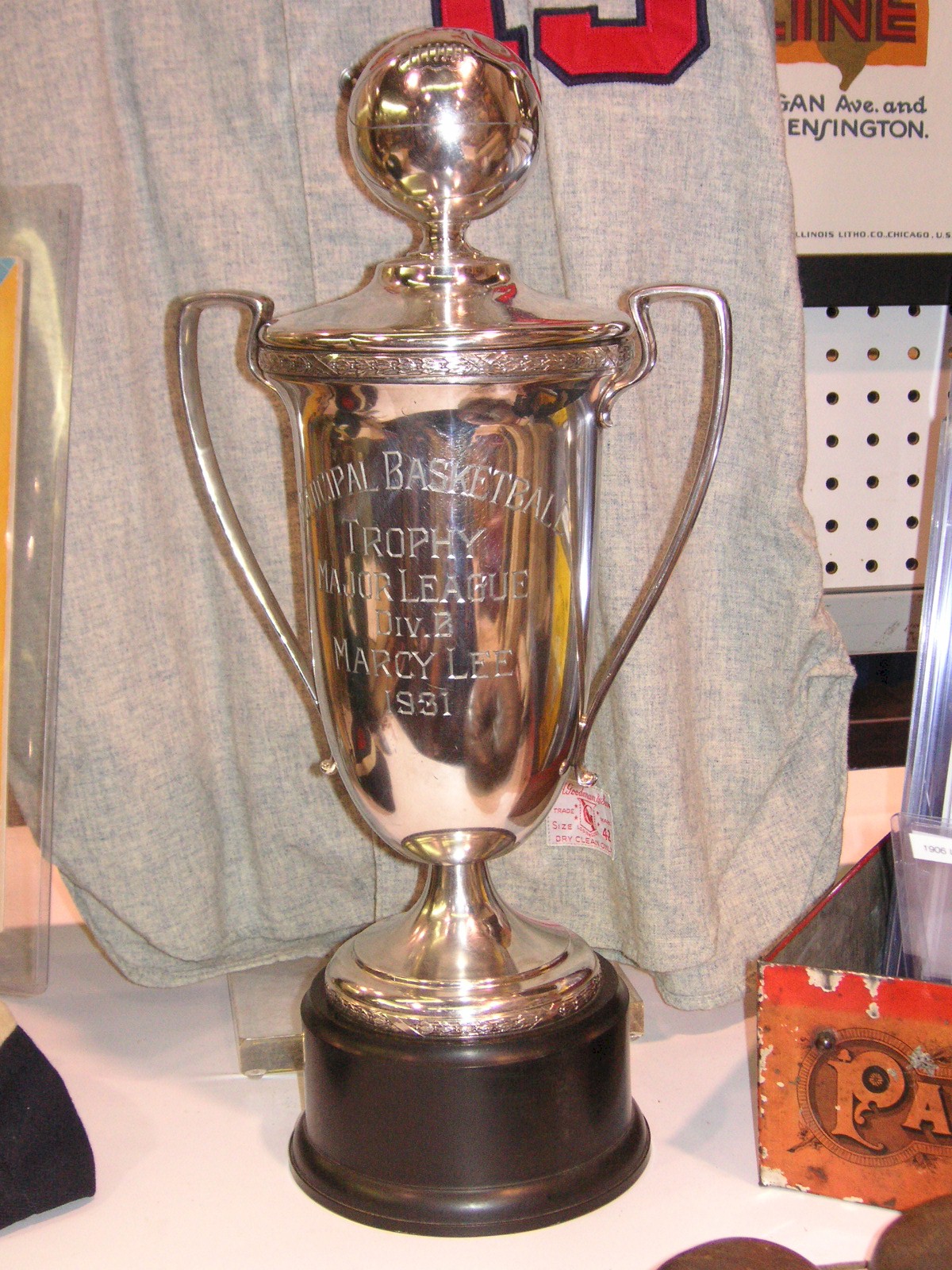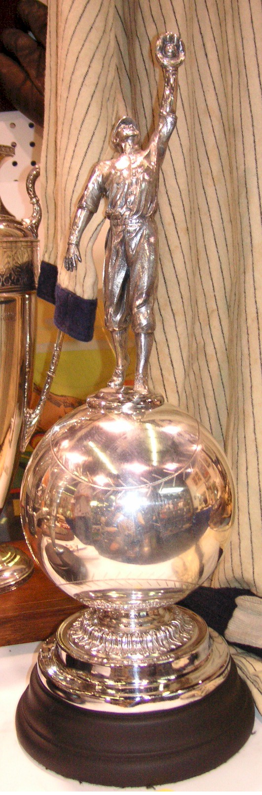 c1930 Spalding football sweater, $275.00. c1950's U.S.C. basketball trophy, $350.00