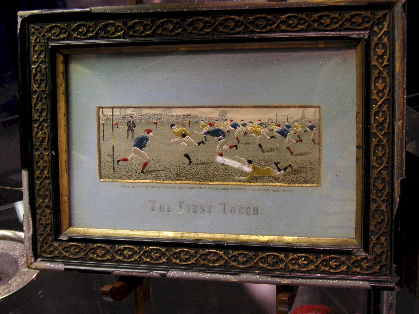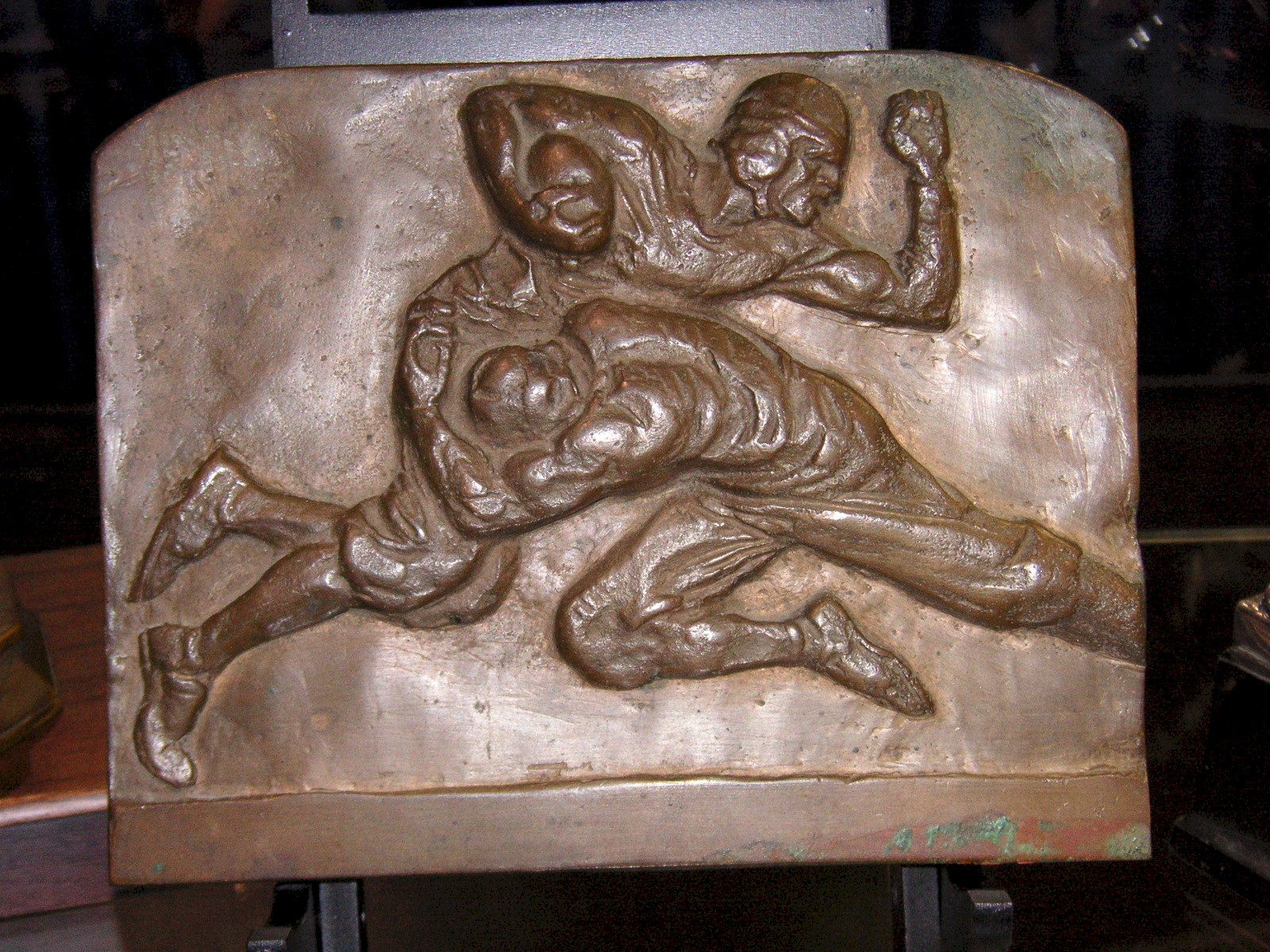 Next in the Kanuit Griffith booth was a very nice hockey trophy with two figural crossed sticks over the base stem, with two pucks on the base. The front read: Simonite Trophy, Community Hockey League 1932, very nice wood base, looked Canadian, 10” tall, $325.00. Next, was a child’s baseball catcher’s mask, which I bought, 9” tall, $195.00. Next was a very striking bronze relief plaque depicting a football player being tackled. It was sculpted by Jack Lincoln Lambert, who did a considerable amount of sports sculpture in the 1920’s and 30’s. 7” x 5 ½”, $675.00. Next was a rare Stevengraph depicting an American football game in progress, titled “The First Touch”. It had the all important original mat, and the frame was period and appeared original as well, 10” x 7” framed, $1,200.00. Next was a c1930’s small round silver plate tray with a lady golfer, made by Wilcox, 3 ¾” tall, $175.00. Next up was a c1930’s trophy with a large figural basketball, not engraved, made by the Homan Manufacturing Company, 9” tall, $275.00.