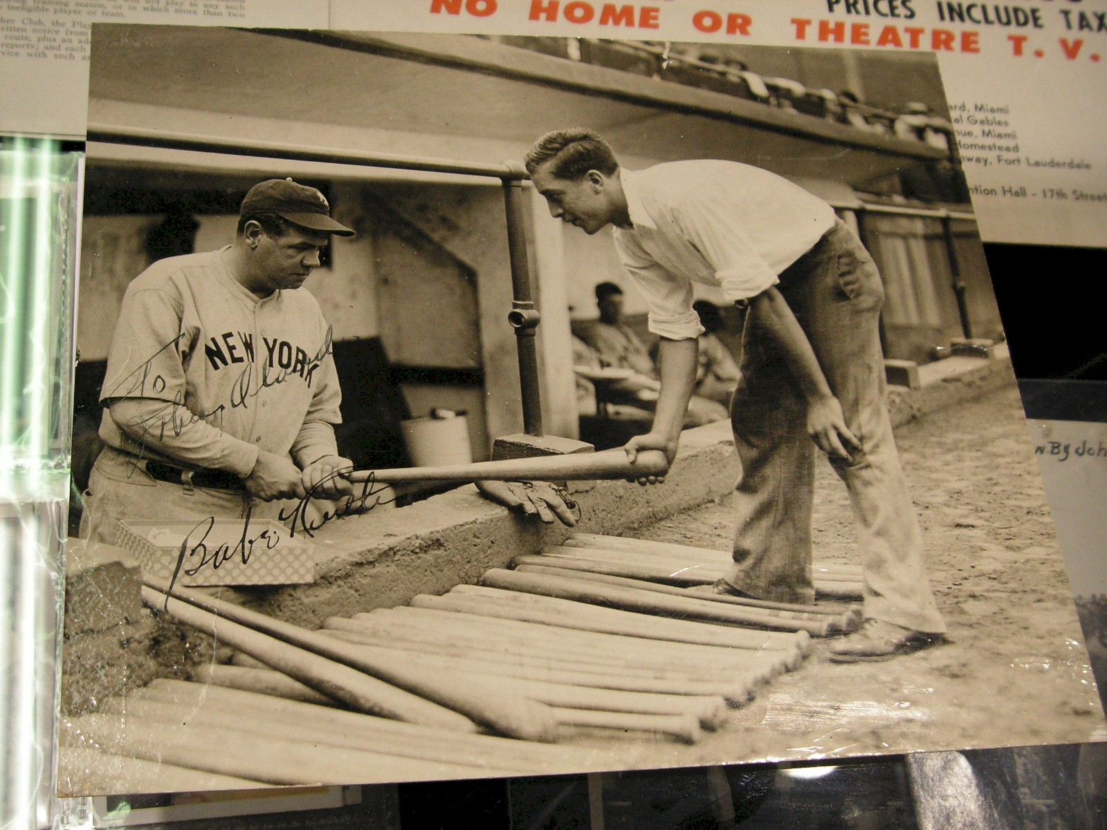 Next up, Leland’s had a die cut advertising sign for PF Canvass shoes, featuring Yogi Berra, 11 3/8” tall, $750.00. Next up was a Walter Camp memorial, University of California vs. St. Mary’s College football program. The program had a photo of Camp in his older years on the cover, had creases vertical and horizontal, $150.00. Next was an original 1962 boxing site poster for Liston vs. Patterson, 22” x 14”, $500.00. Site posters are very rare I probably should have gotten it for that price. Next up was a great photo of Jack Johnson and Stanley Ketchel squaring off in a boxing ring in San Francisco in 1909, 8 3/8” wide x 6 3/8” tall, $2,500.00. Next up, a 6 pack of Ted’s Root Beer in the original carrying carton, three full, three empty, $1,200.00. I’d never seen one of those before. Next up, a walking cane presented by boxing great Battling Nelson. Engraved on the silver cap: John Day from Battling Nelson Champion of the World 1909, unquote, 35 5/8” Tall, $1,000.00. Next up was a c1927 signed photo of Jack Dempsey swing a baseball bat, 9 ¼” x 7 ½”, $400.00. Next up was a signed photo of Babe Ruth picking out a bat while standing in a dugout, 8 ¾” x 7 ½”, $6,500.00. Last from the Leland’s booth was a huge 31” tall, c1927 Woodcliff Leasure League baseball trophy, $3,000.00. This piece provided a fun little spin for me. I bought it there at the National from David Hunt for $800.00. I carried it back to my booth where Josh Evans of Leland’s was there. Josh complimented it, and I told him I just got it from David Hunt for $800.00. Josh asked me to give him a shot at it if I decided to sell it. I told him, how about $1,500.00? and he bought it on the spot. I owned it about 7 minutes. That’s $100 a minute.