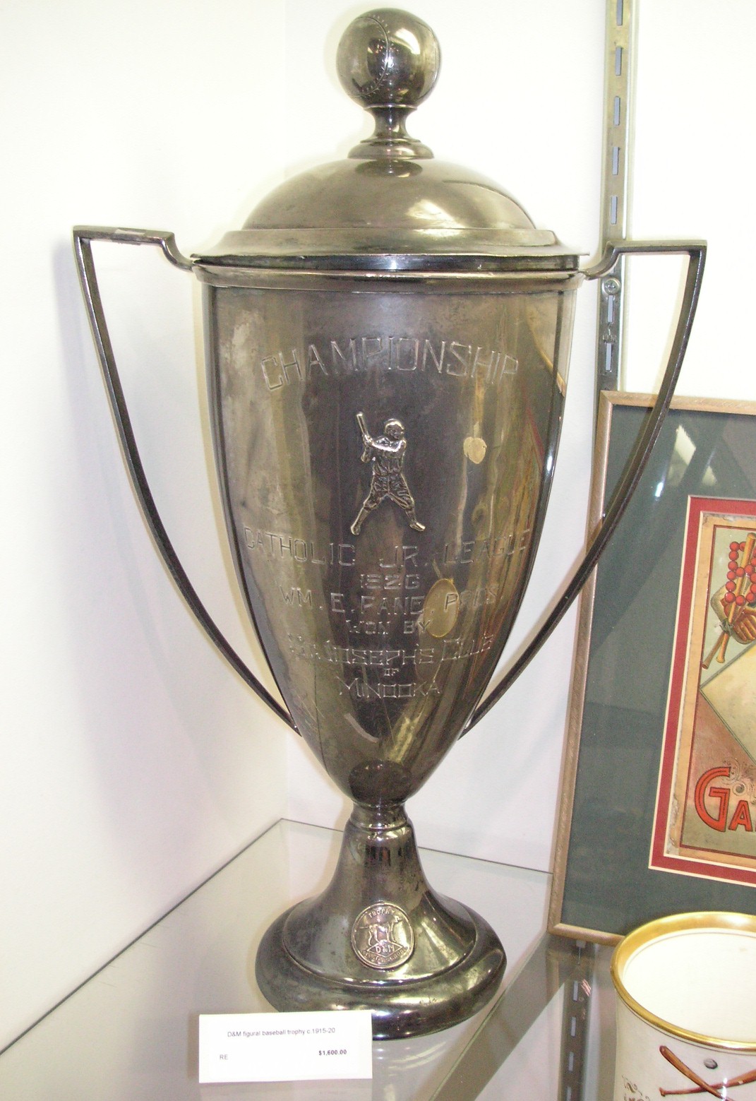 Next up was a 1926 Catholic Jr. League baseball loving cup Championship trophy with a small relief of a batter mounted within the engraving, 18” x 11”, $1,600.00. Next was