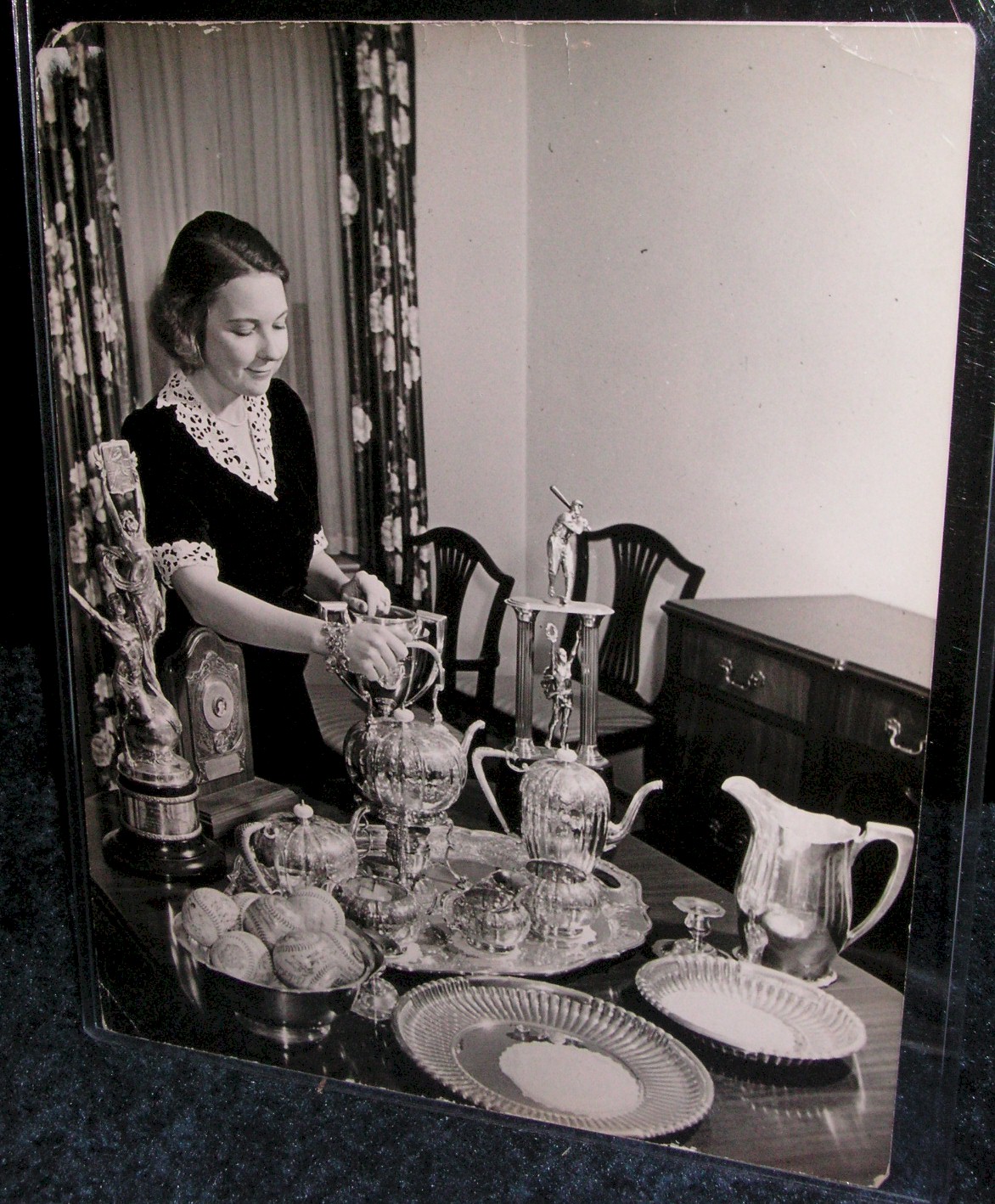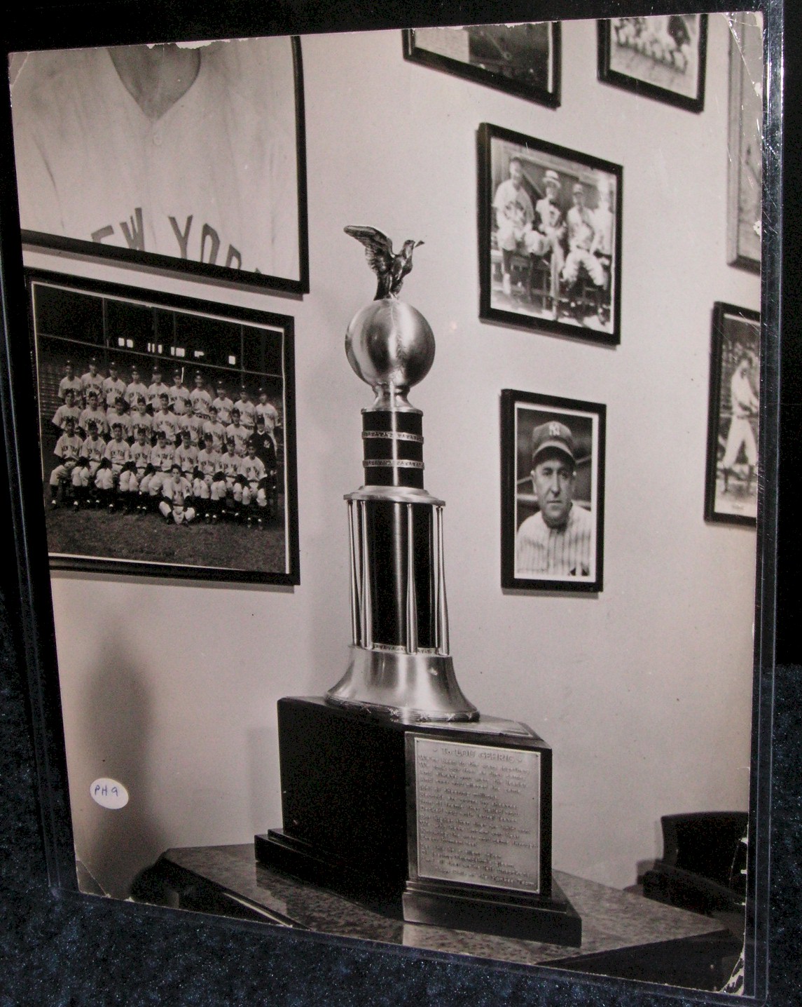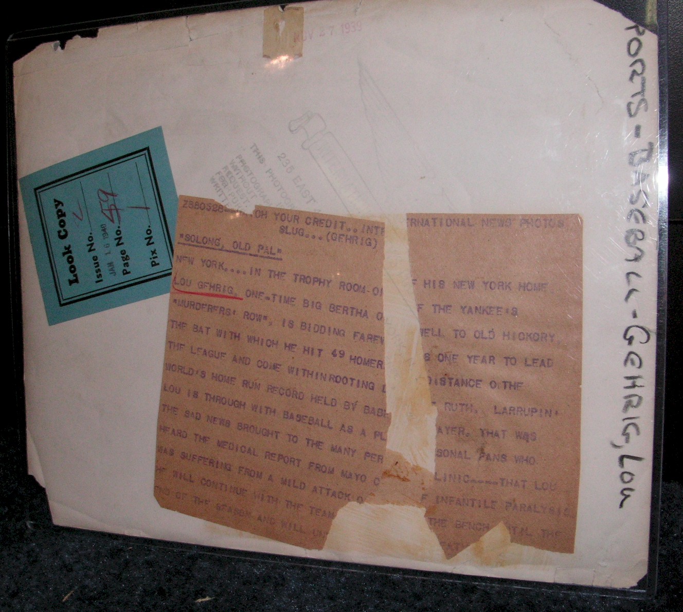 The story copy on back of the one reads: “SOLONG OLDPAL” [sic] NEW YORK.....IN THE TROPHY ROOM OF HIS NEW YORK HOME. LOU GEHRIG ONE TIME BIG BERTHA OF THE YANKEE’S “MURDERS’ ROW” , IS BIDDING FAREWELL TO OLD HICKORY THE BAT HE HIT 49 HOMERS ONE YEAR TO LEAD THE LEAGUE AND COME WITHINROOTING [sic] DISTANCE OF THE WORLD’S HOME RUN RECORD HELD BY BABE RUTH. LARRUPIN LOU IS THRU WITH BASEBALL AS A PLAYER. THAT WAS THE SAD NEWS BROUGHT TO THE MANY PERSONAL FANS WHO HEARD THE MEDICAL REPORT FORM MAYO CLINIC...THAT LOU WAS SUFFERING FROM A MILD ATTACK OF INFANTILE PARALYSIS. HE WILL CONTINUE WITH THE TEAM ON THE BENCH UNTIL THE END OF THE SEASON AND WILL -END/REST TORN