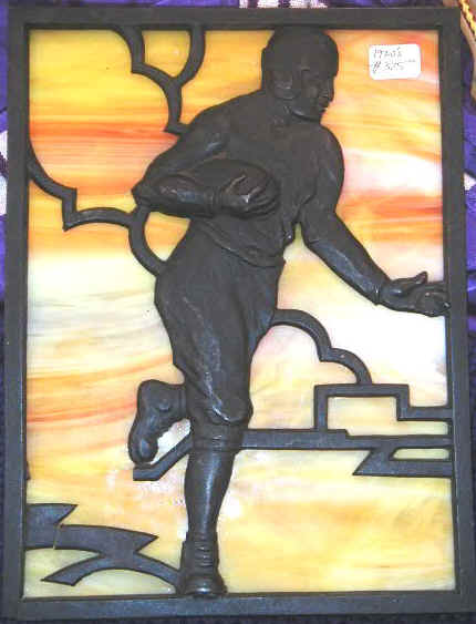 football plaque made of bronze and stained glass in yellow & red, 9" x 6 ľ", price: $375.00, had a crack in the bronze, at the top, but didn't show much. These are interesting; I have the mate, a passer that looks like Red Grange, which has a white glass background. I've seen a golfer of the same genre in a book as well, no maker on them, suspect they may be German.