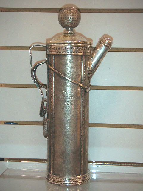 Next up, a boat load (3) of exceptional silver plate trophies, offered by the prolific Darrell O'Mary of Sports Paradise, from Marietta, GA. First was a heck of a unique cocktail shaker