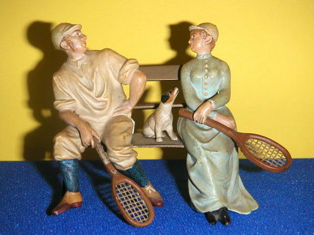 Today’s feature is what is known as a Vienna Bronze. Vienna bronzes, produced in Vienna, the capital city of Austria,…you know, the country Arnold’s from,…are known for their fine detail, small size, and colorful finishes. They were produced from about 1850-1920, in many subjects and are usually between one and five inches tall. Vienna bronzes are often referred to as being cold painted, or polychrome, which essentially just means they were hand painted at the studio or factory. Good sports ones are very rare, and I believe this example is the rarest of the tennis ones.