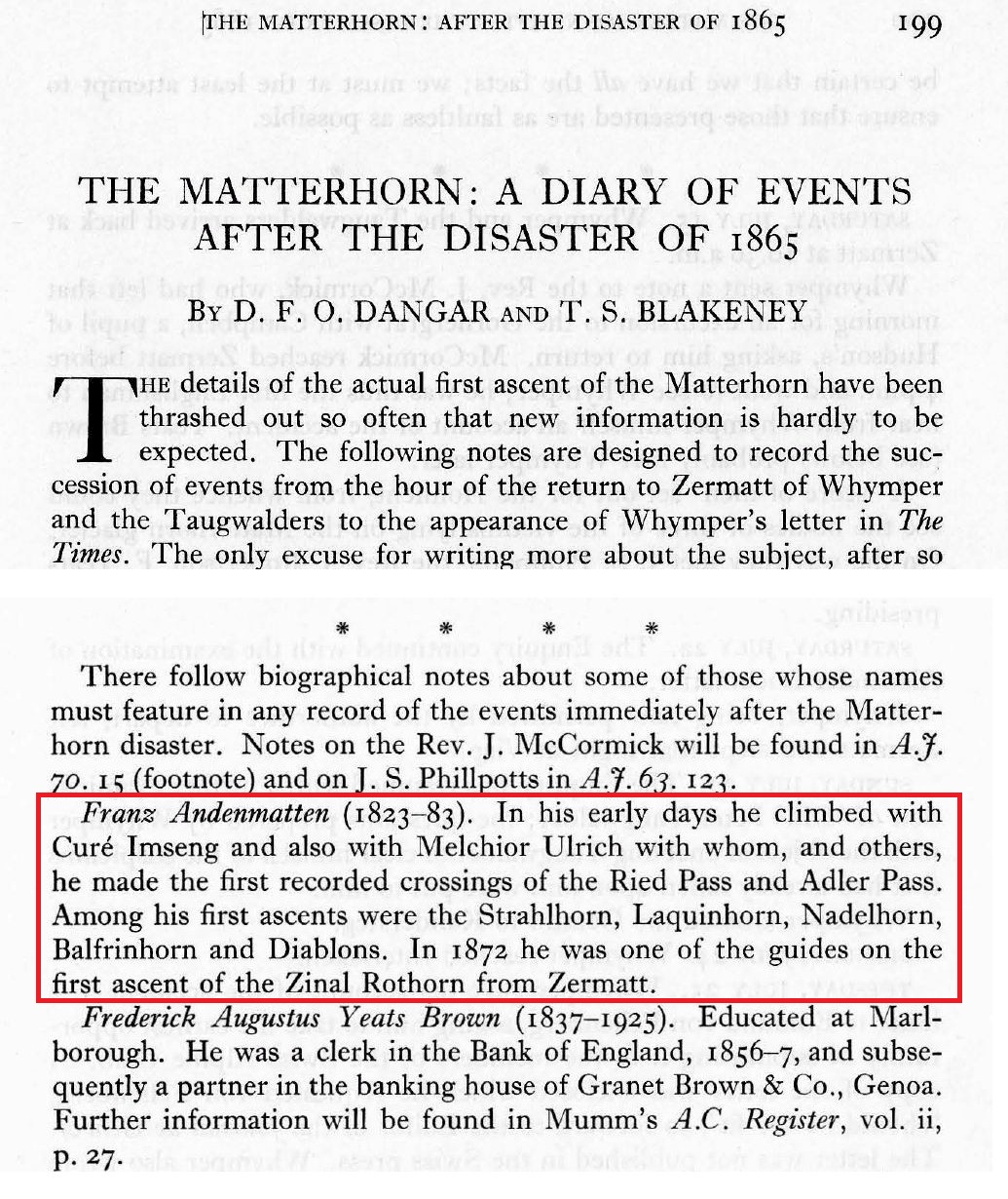 It didn’t take long and I learned a Franz-Josef Andenmatten 1823-1883 had been a mountaineering guide in Switzerland…and not just any mountaineering guide…but one from early on…from the time mountaineering began to capture the imagination of the public from newspaper and magazine accounts in the 1850’s. Moreover I learned Franz-Josef Andenmatten was the first to
