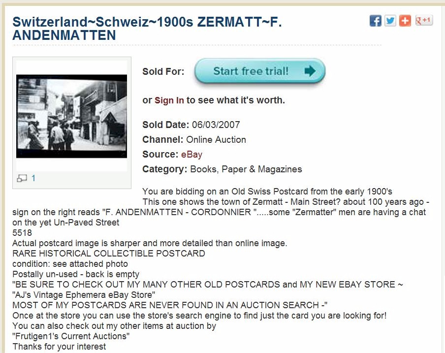 As I researched them further I found a sales record of a c1900 postcard of a street in the village of Zermatt in the Swiss Alps. A shop can be seen in the photo with a sign reading: “F. ANDENMATTEN – CORDONNIER”. Cordonnier is French for shoemaker.