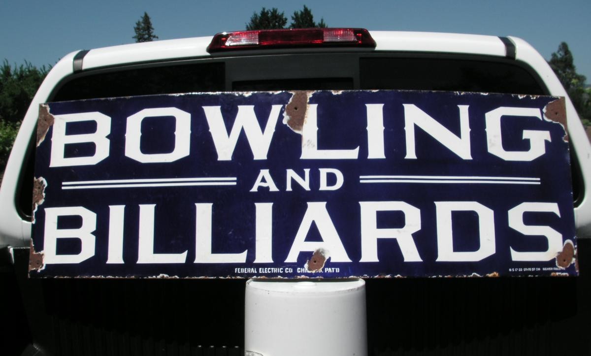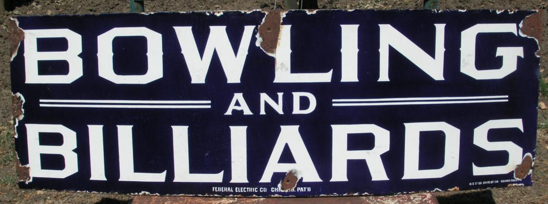 This last weekend I attended the once a year the Old West Antiques Show in Grass Valley CA and found this Bowling and Billiards sign. It’s cobalt blue porcelain, 54” wide x 18” tall. I’ve been attending this show for about ten years and this is one of the best pieces I’ve picked up there. The show is known for having great quality, one of the last great shows going. I had to give serious money but now that I’ve had time to digest it I’m very glad I pulled the trigger! A lot of both Bowling and Billiards were played in Europe in the 19th and early 20th century….But this sign in pure 100% American, prominently marked Federal Electric Co. Chicago Patn’d!!!!
