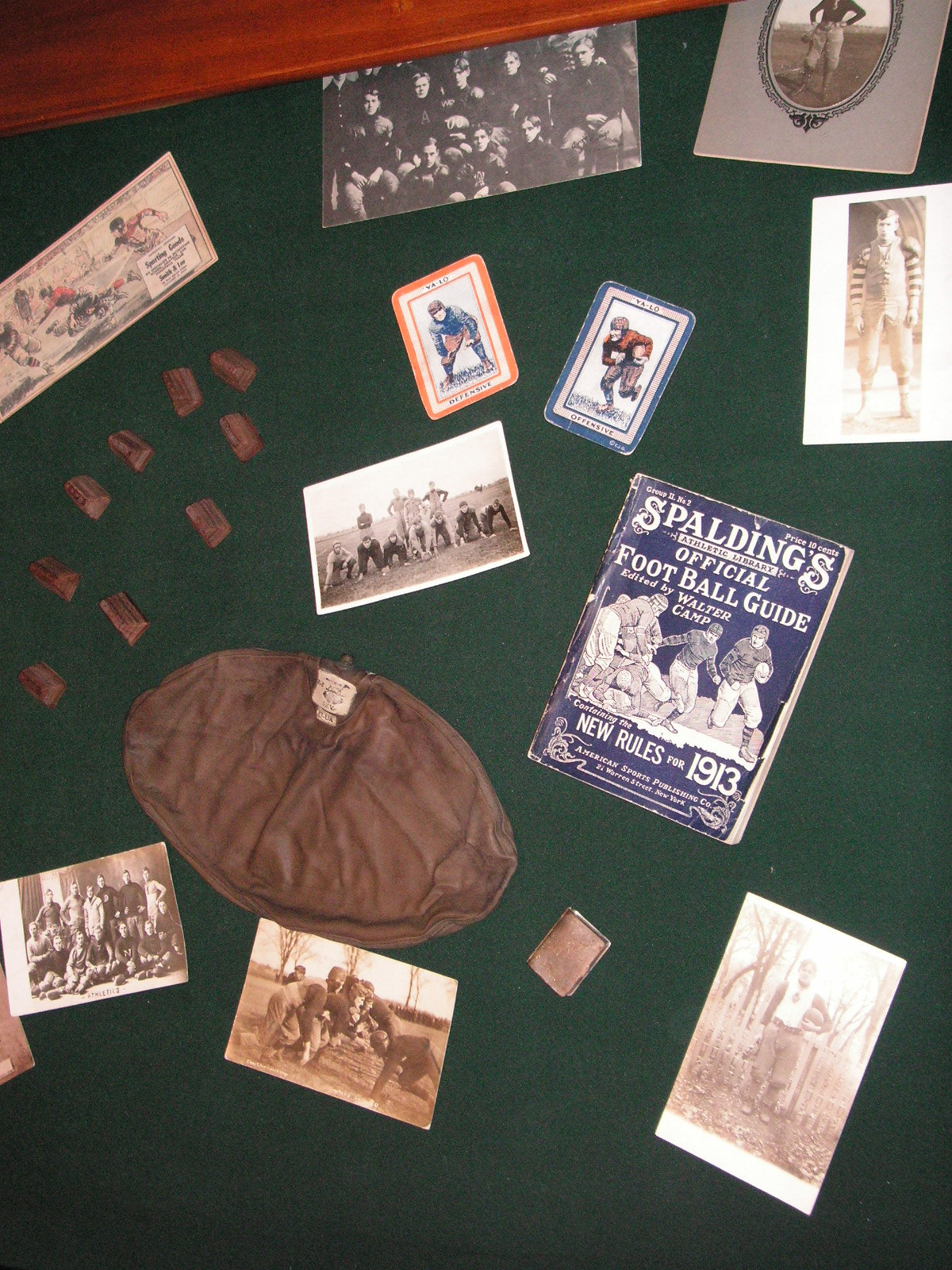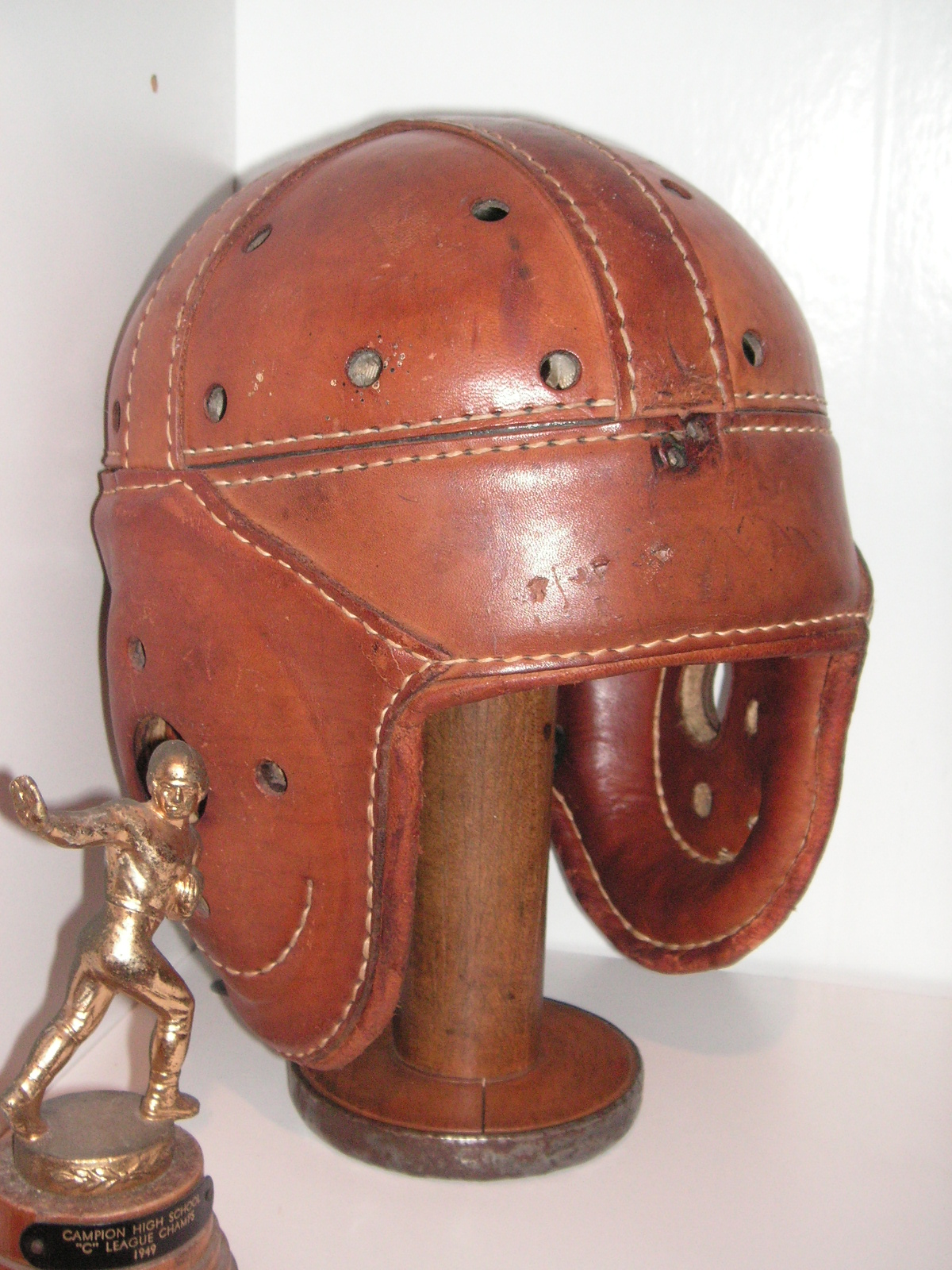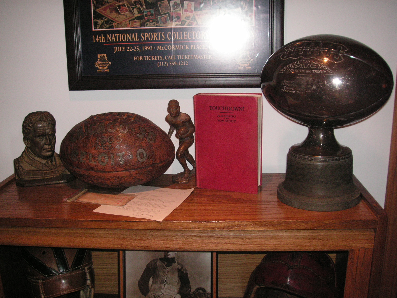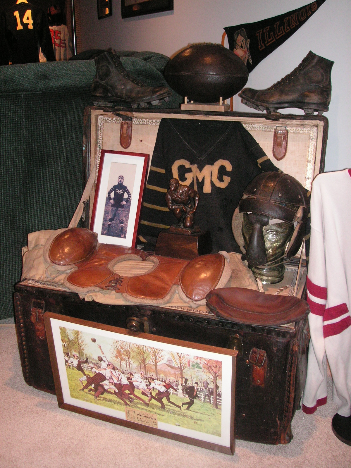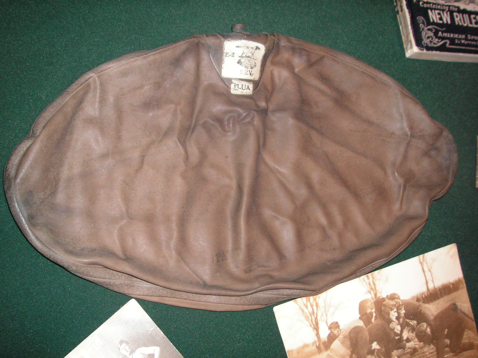 "I've been collecting vintage football items for about 13 years. I started by just wanting 1 leather football helmet. Loving the game of football so much as a player and coach, I was intrigued with the roots of the game. I searched every antique shop I came to with no luck for over a year. My parents found 2 old 1940's leather helmets at an antique shop in Wisconsin and bought them for me for Christmas 13 years ago and that was the start of my obsession. I enjoy having a nice assortment of items that span the decades the game has been played. I often wish I could go back and talk to the men who used to