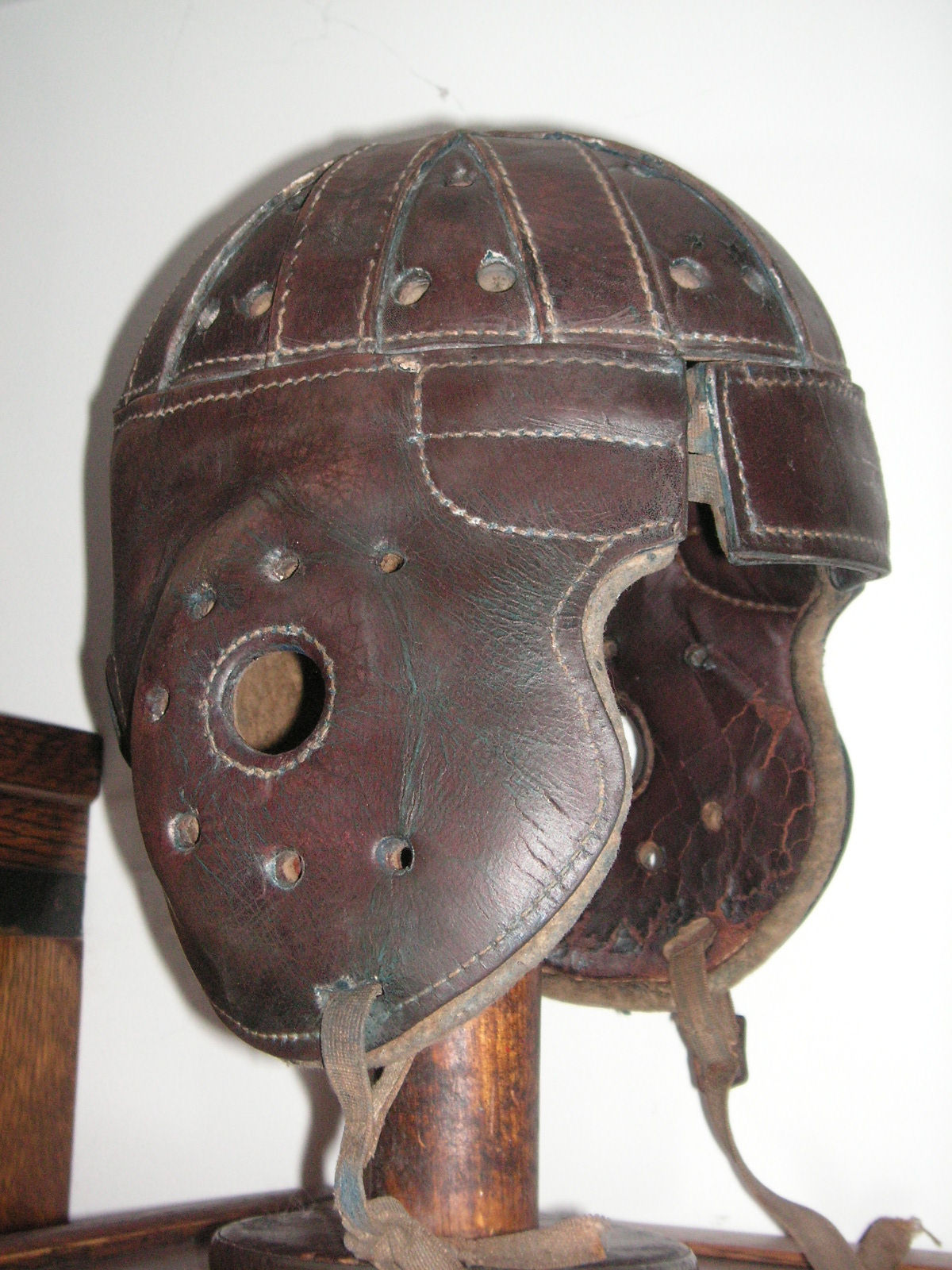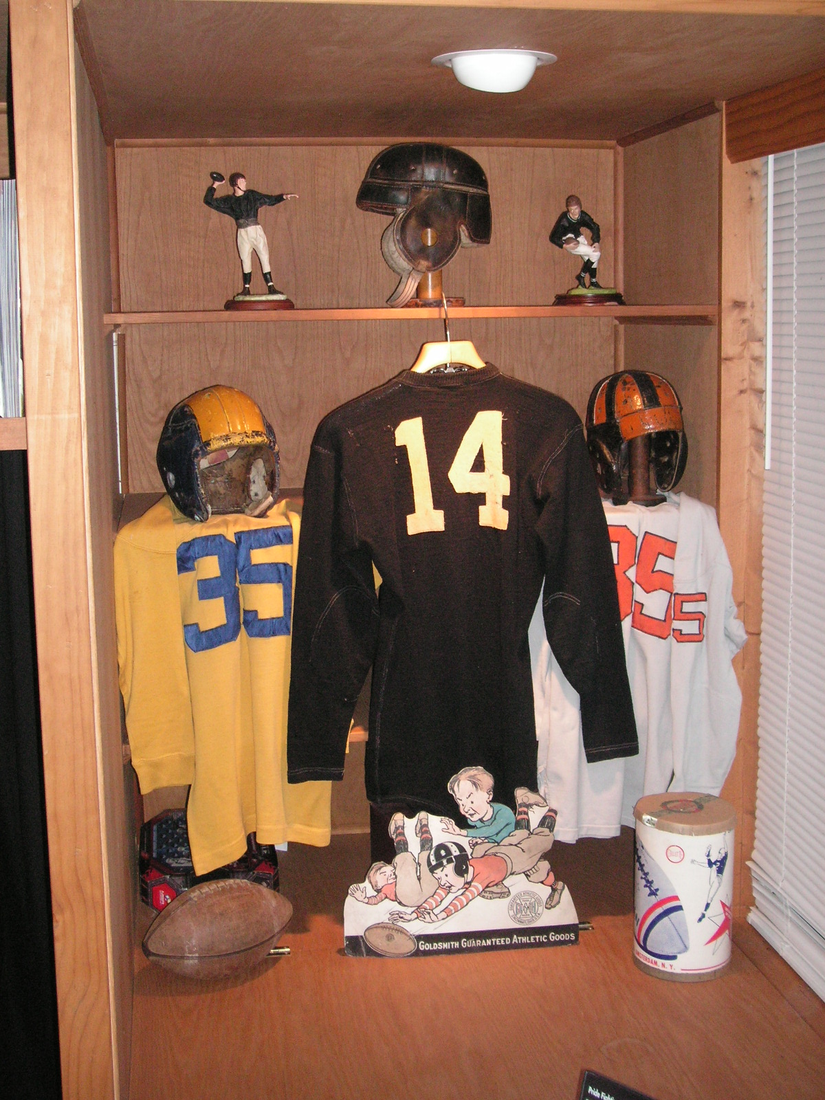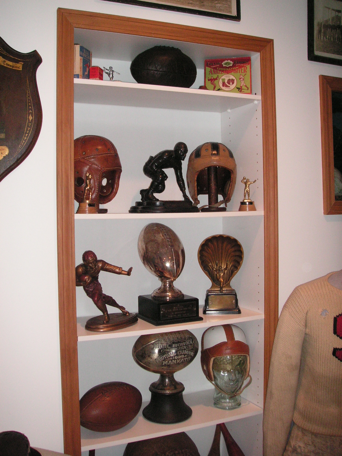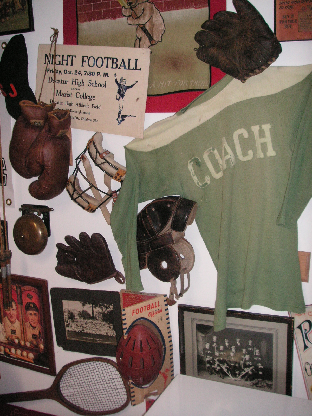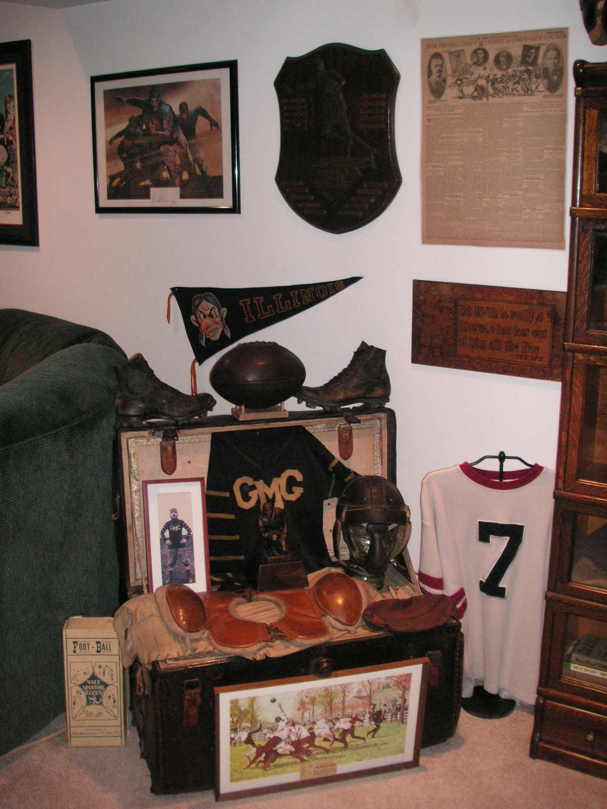 "I've been collecting vintage football items for about 13 years. I started by just wanting 1 leather football helmet. Loving the game of football so much as a player and coach, I was intrigued with the roots of the game. I searched every antique shop I came to with no luck for over a year. My parents found 2 old 1940's leather helmets at an antique shop in Wisconsin and bought them for me for Christmas 13 years ago and that was the start of my obsession. I enjoy having a nice assortment of items that span the decades the game has been played. I often wish I could go back and talk to the men who used to