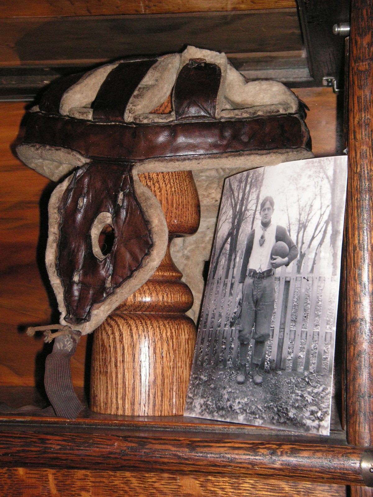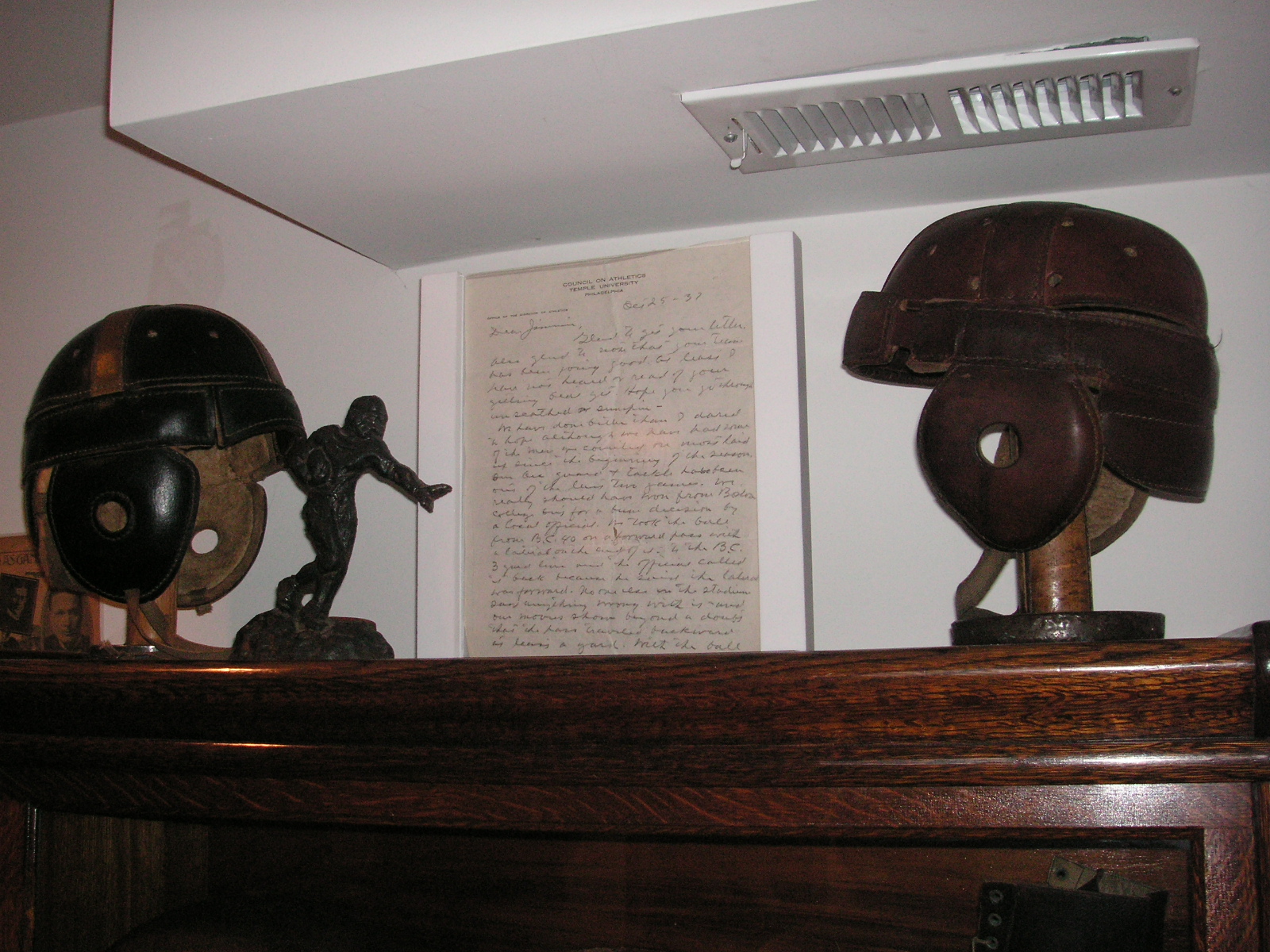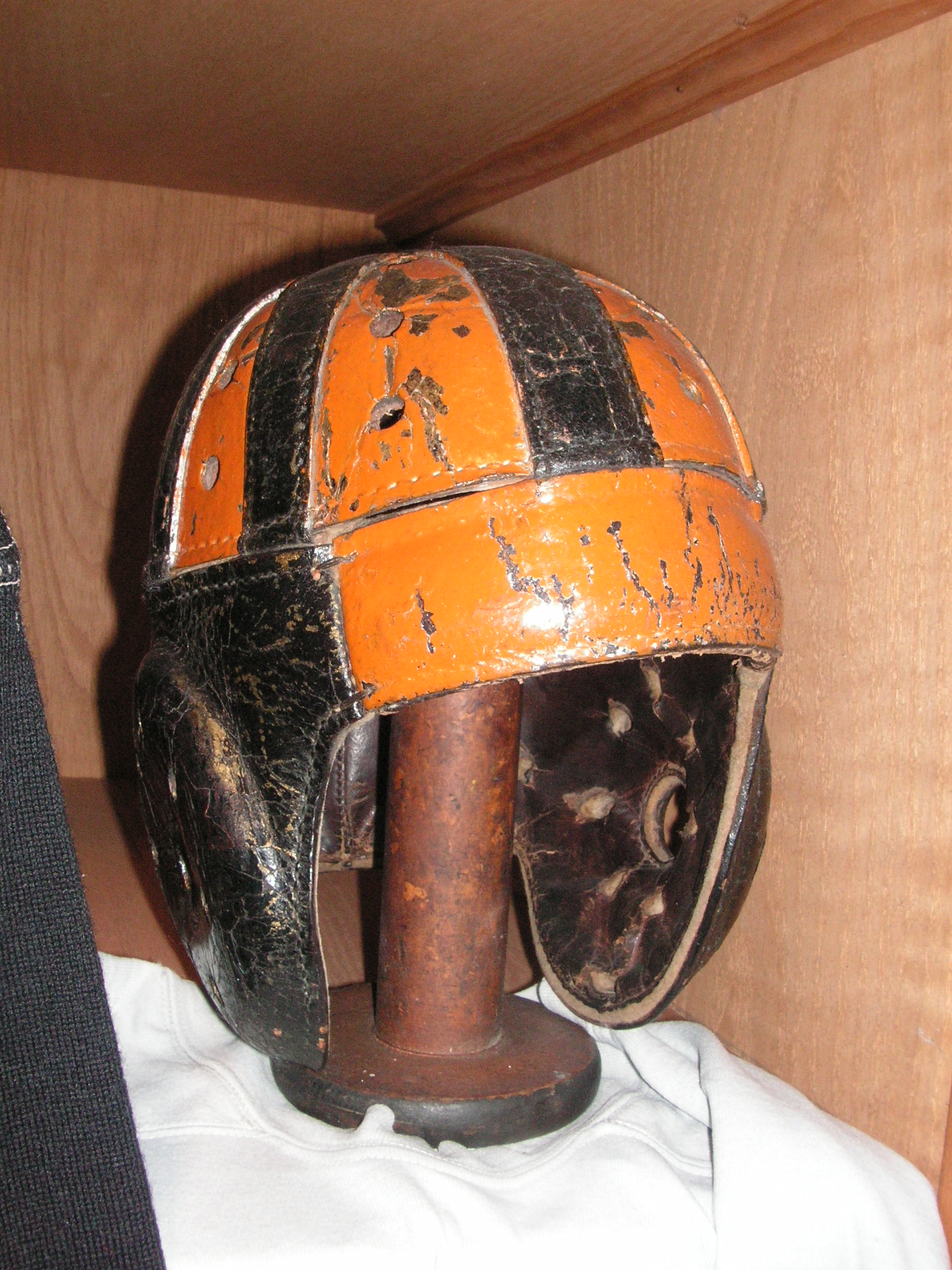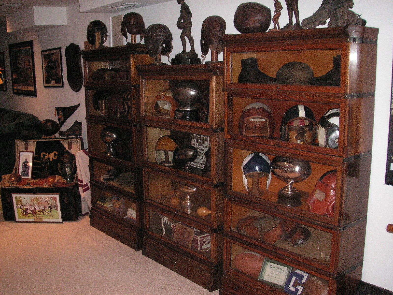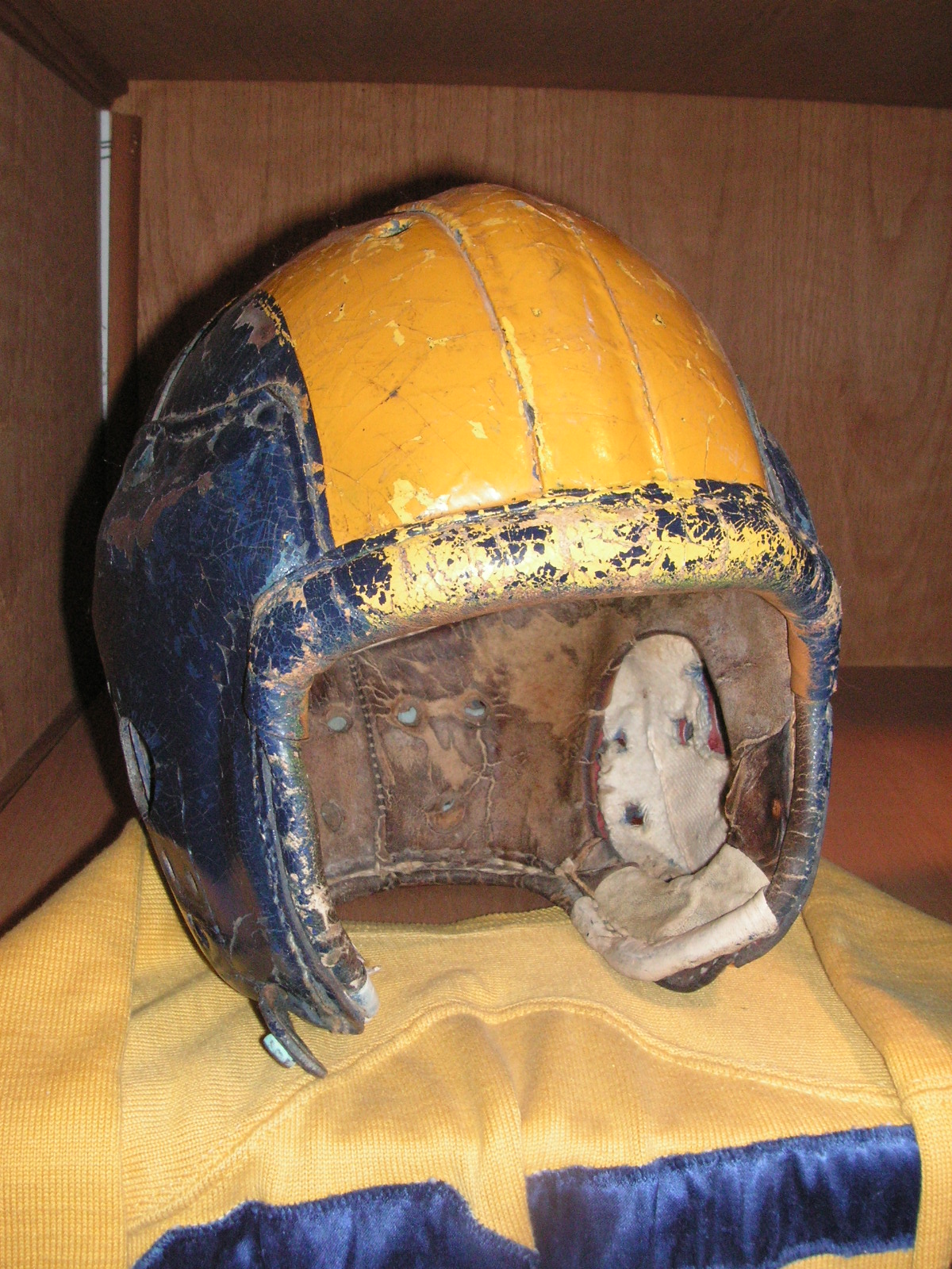 "I've been collecting vintage football items for about 13 years. I started by just wanting 1 leather football helmet. Loving the game of football so much as a player and coach, I was intrigued with the roots of the game. I searched every antique shop I came to with no luck for over a year. My parents found 2 old 1940's leather helmets at an antique shop in Wisconsin and bought them for me for Christmas 13 years ago and that was the start of my obsession. I enjoy having a nice assortment of items that span the decades the game has been played. I often wish I could go back and talk to the men who used to