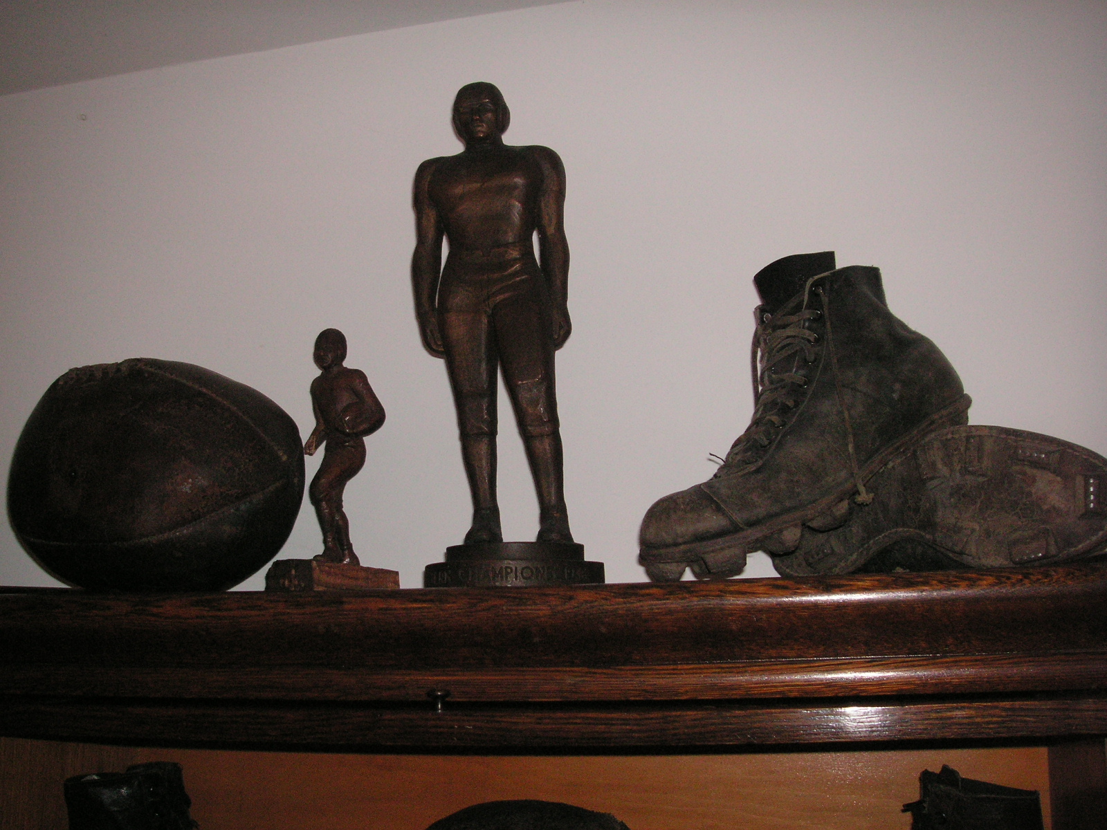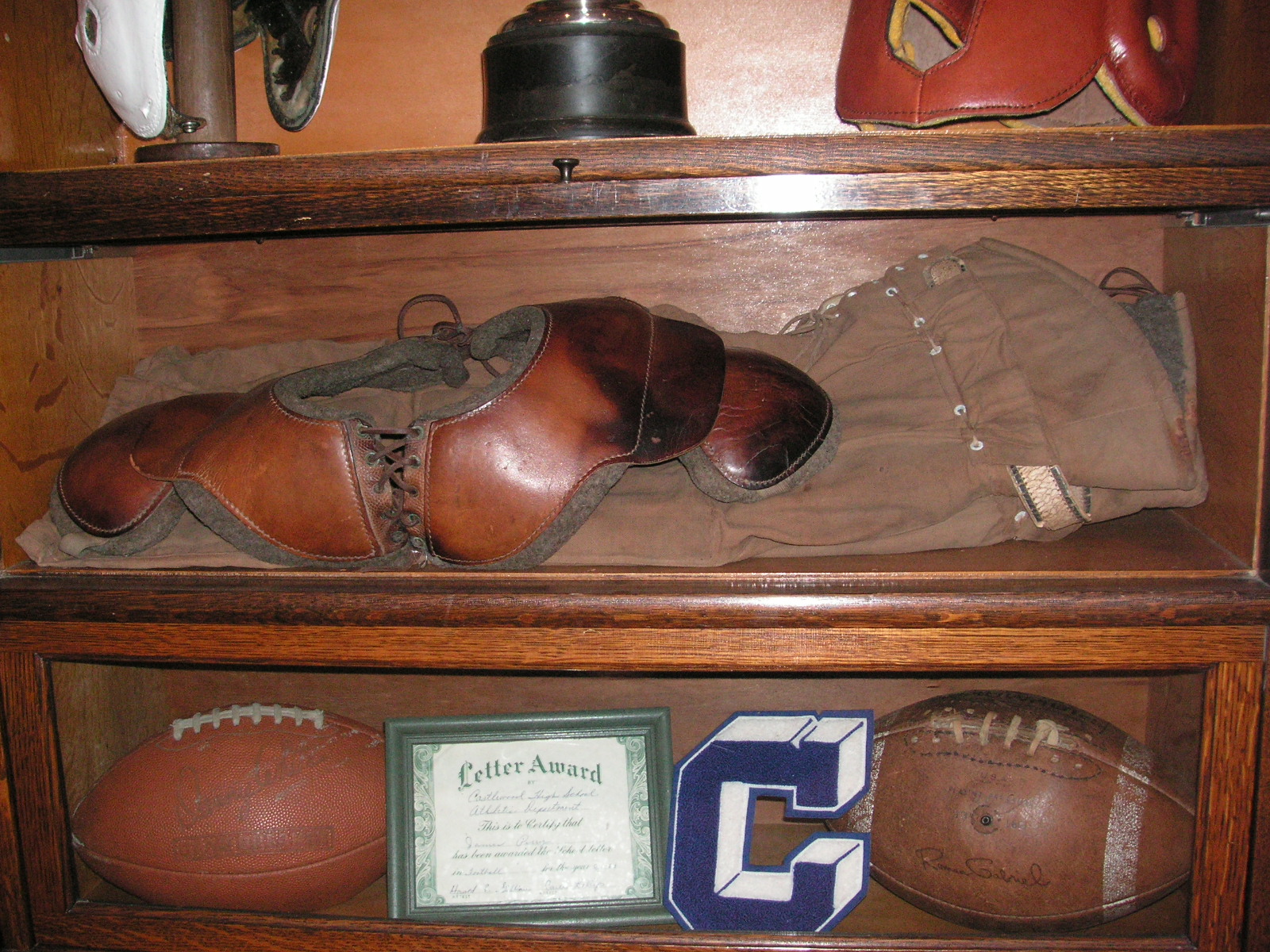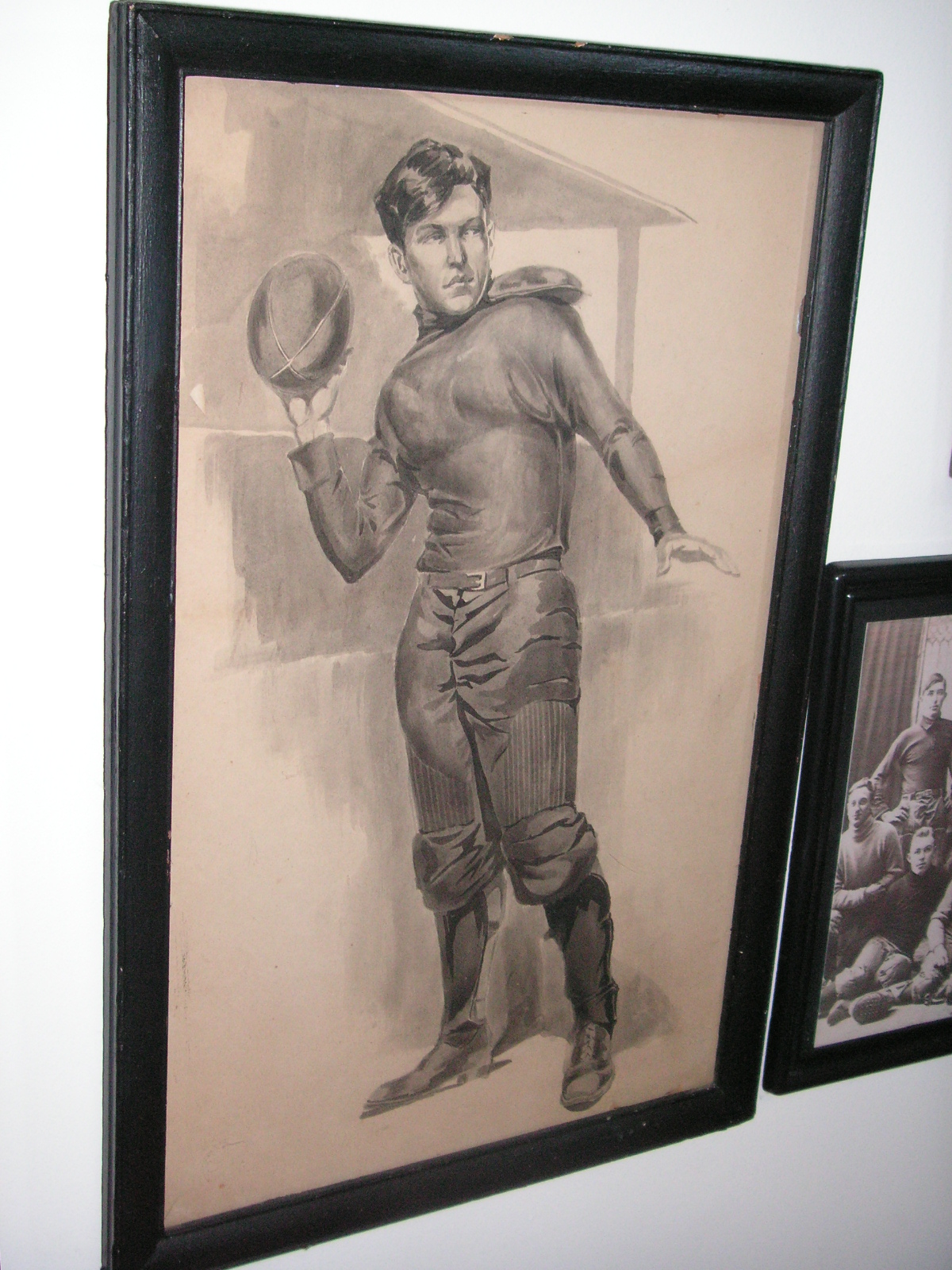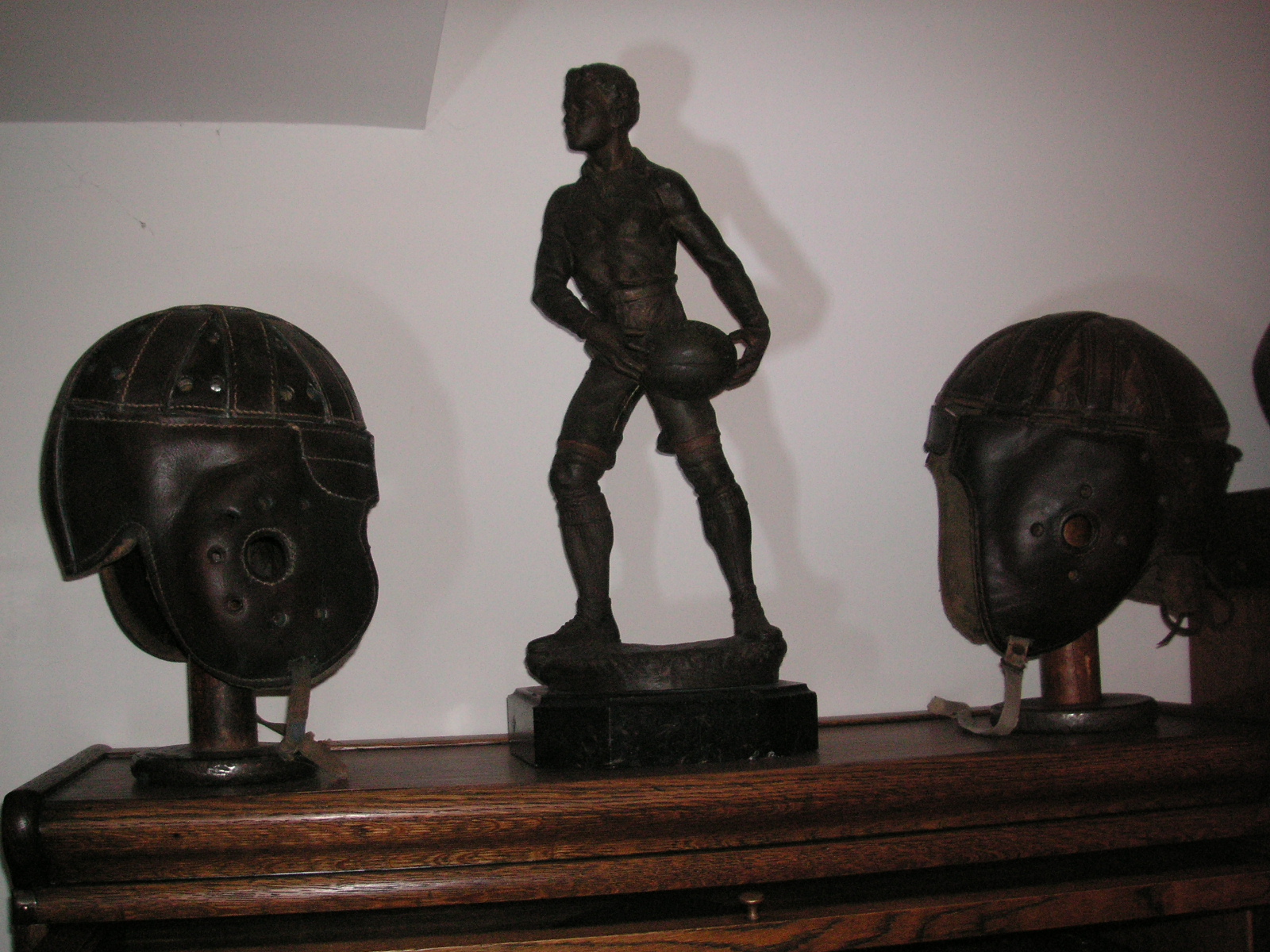 "I've been collecting vintage football items for about 13 years. I started by just wanting 1 leather football helmet. Loving the game of football so much as a player and coach, I was intrigued with the roots of the game. I searched every antique shop I came to with no luck for over a year. My parents found 2 old 1940's leather helmets at an antique shop in Wisconsin and bought them for me for Christmas 13 years ago and that was the start of my obsession. I enjoy having a nice assortment of items that span the decades the game has been played. I often wish I could go back and talk to the men who used to