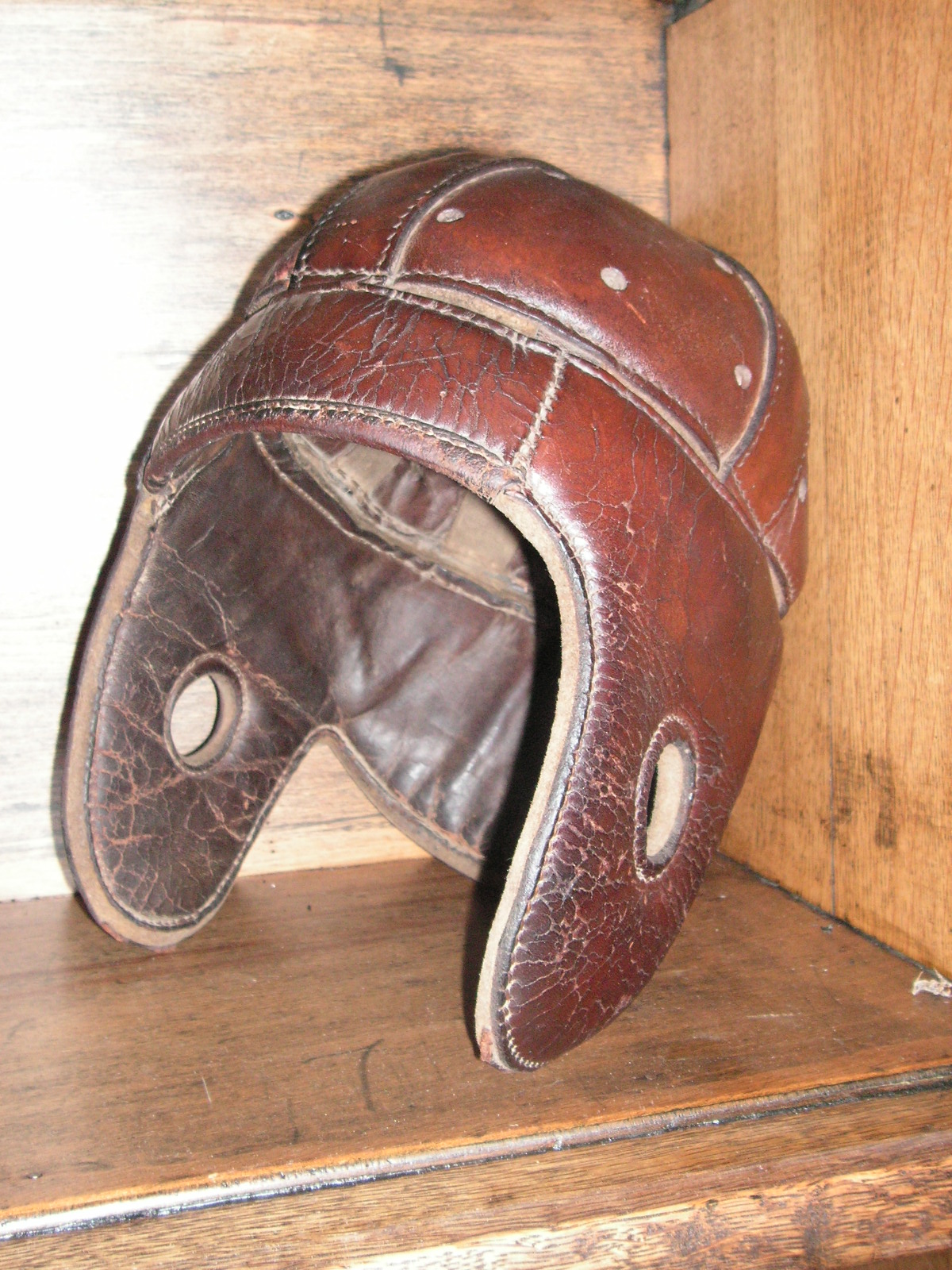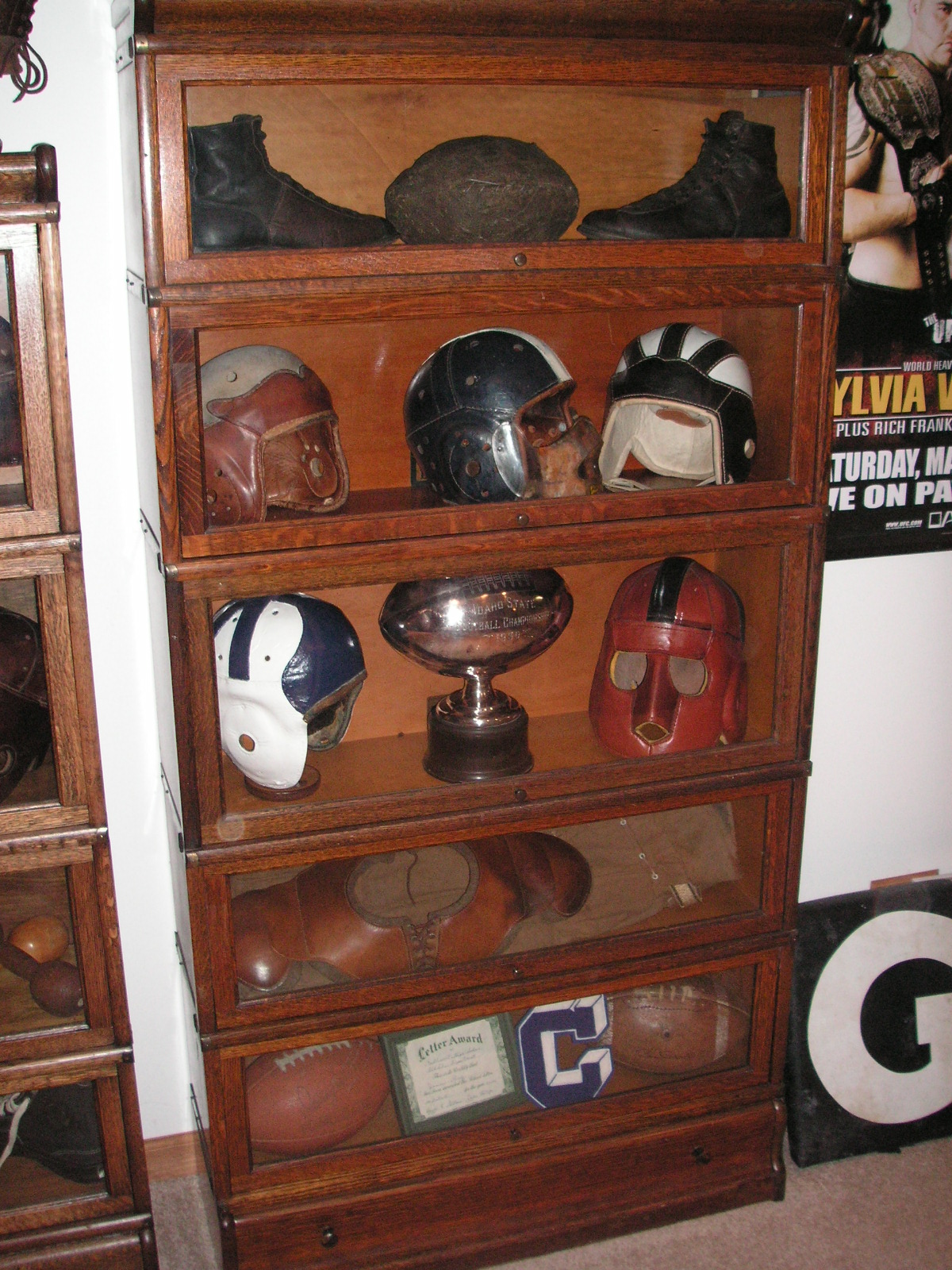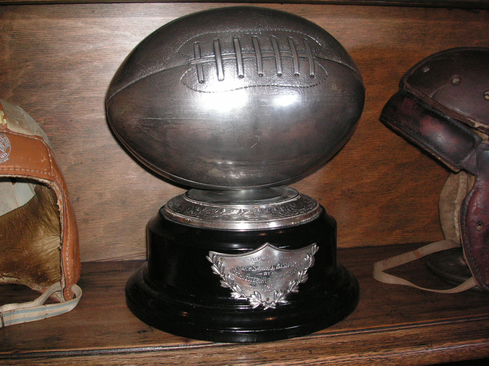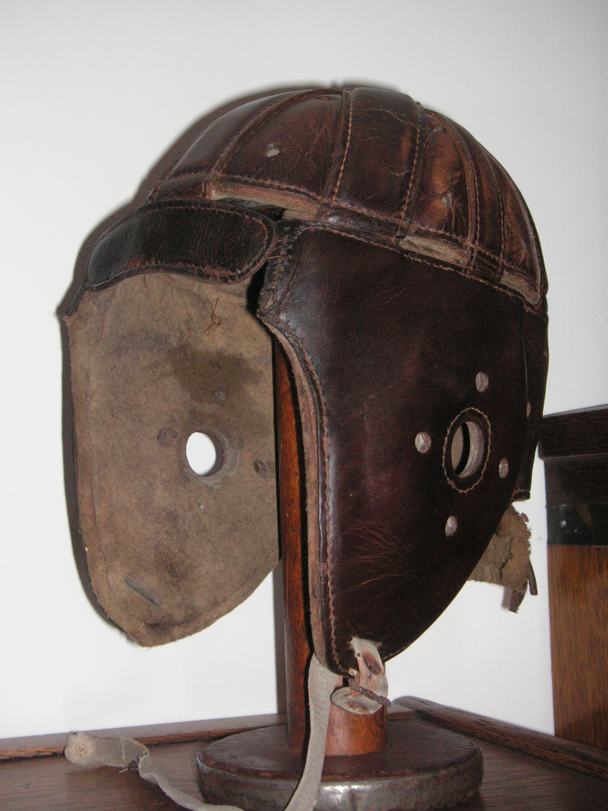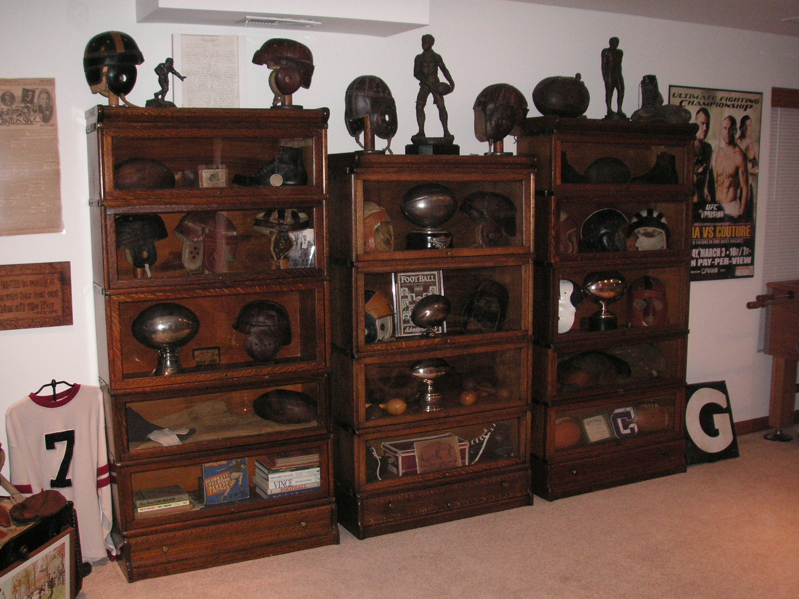 "I've been collecting vintage football items for about 13 years. I started by just wanting 1 leather football helmet. Loving the game of football so much as a player and coach, I was intrigued with the roots of the game. I searched every antique shop I came to with no luck for over a year. My parents found 2 old 1940's leather helmets at an antique shop in Wisconsin and bought them for me for Christmas 13 years ago and that was the start of my obsession. I enjoy having a nice assortment of items that span the decades the game has been played. I often wish I could go back and talk to the men who used to