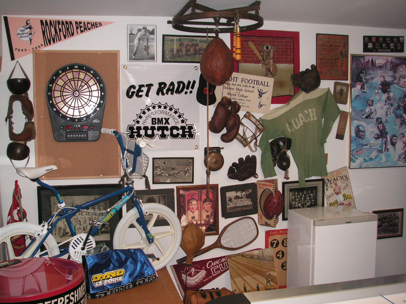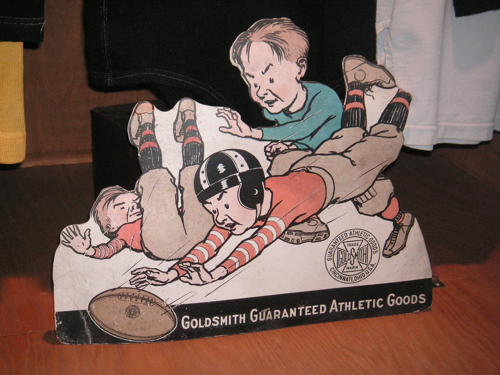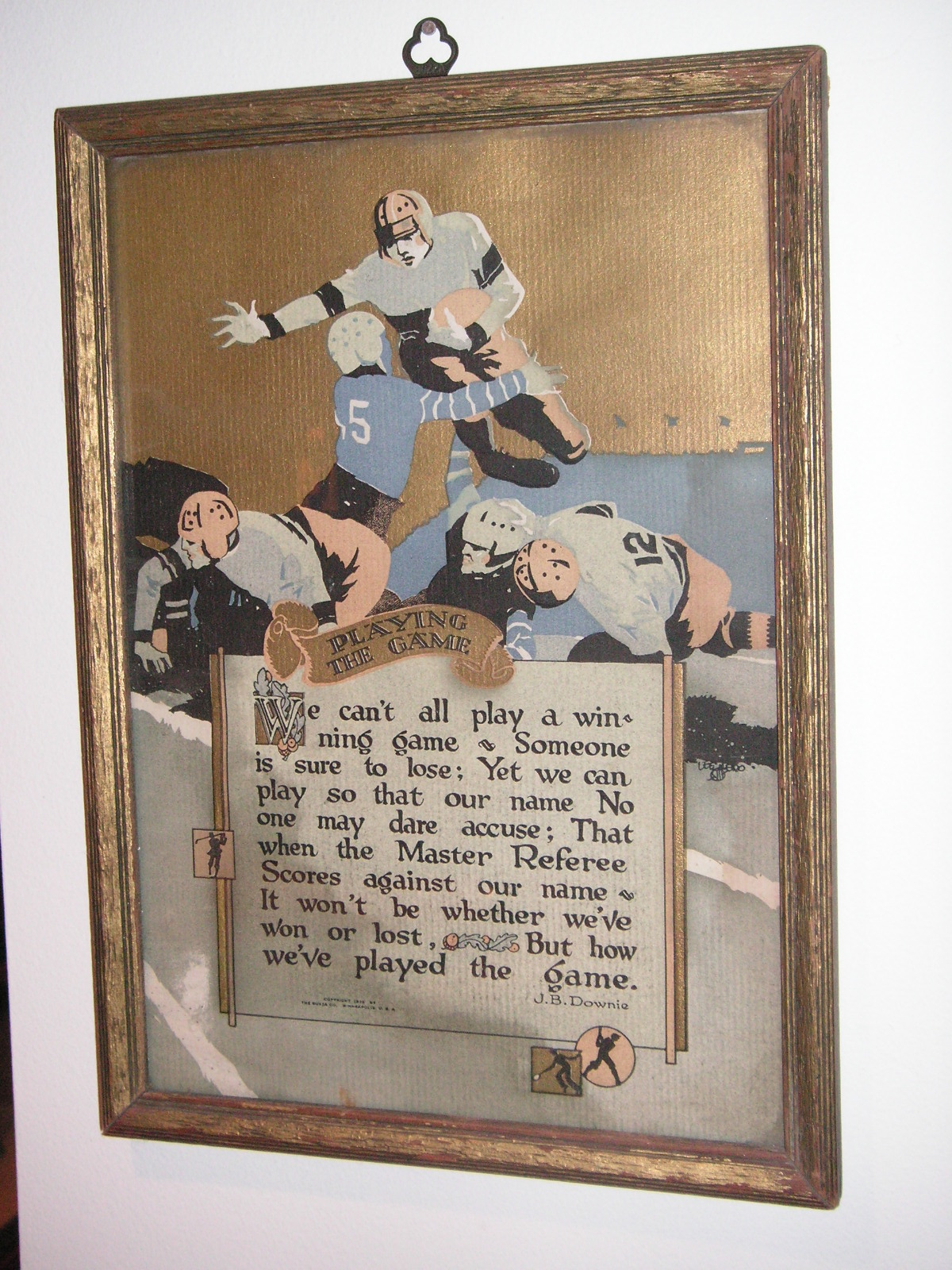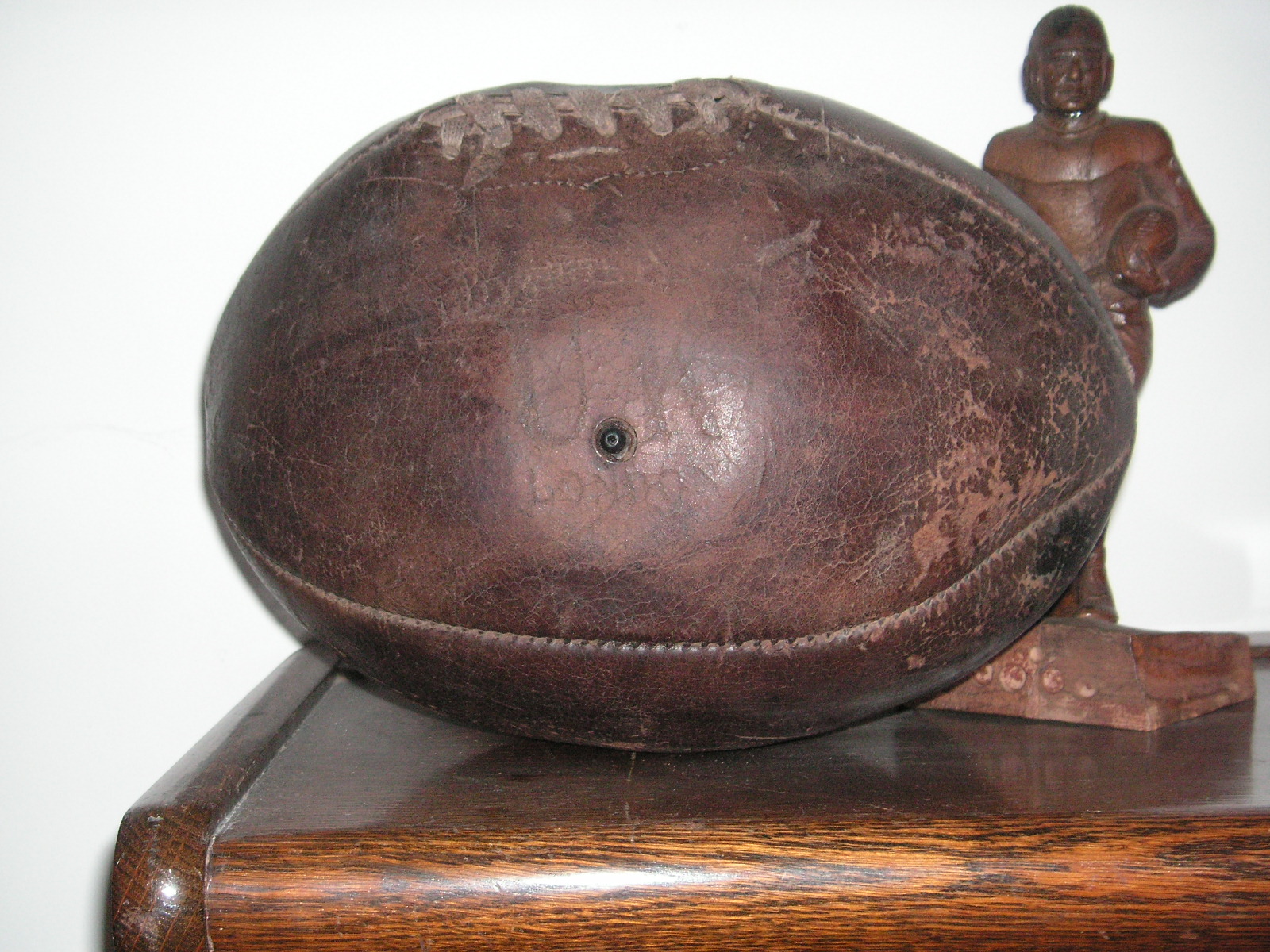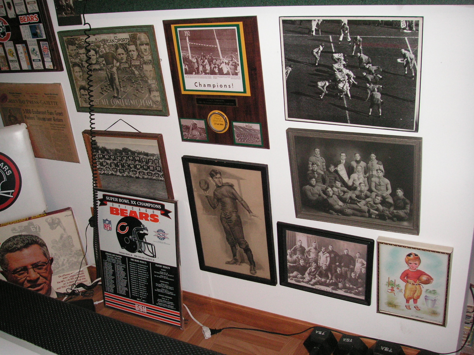 "I've been collecting vintage football items for about 13 years. I started by just wanting 1 leather football helmet. Loving the game of football so much as a player and coach, I was intrigued with the roots of the game. I searched every antique shop I came to with no luck for over a year. My parents found 2 old 1940's leather helmets at an antique shop in Wisconsin and bought them for me for Christmas 13 years ago and that was the start of my obsession. I enjoy having a nice assortment of items that span the decades the game has been played. I often wish I could go back and talk to the men who used to