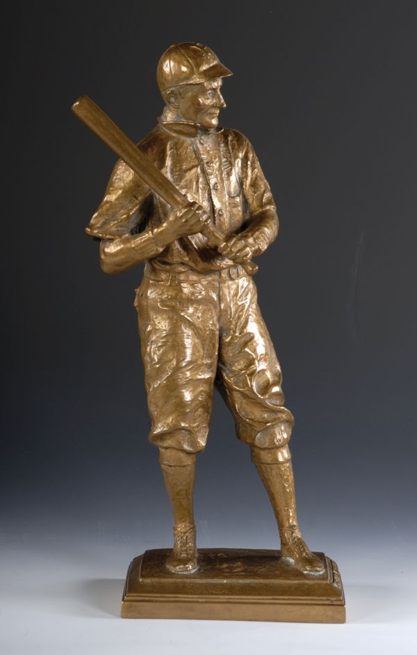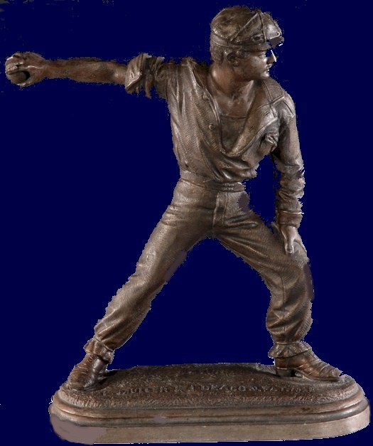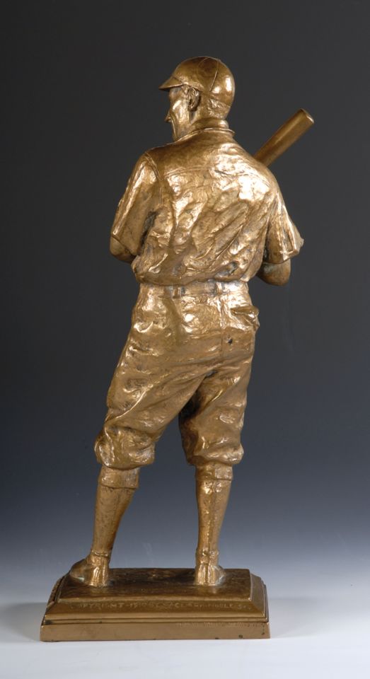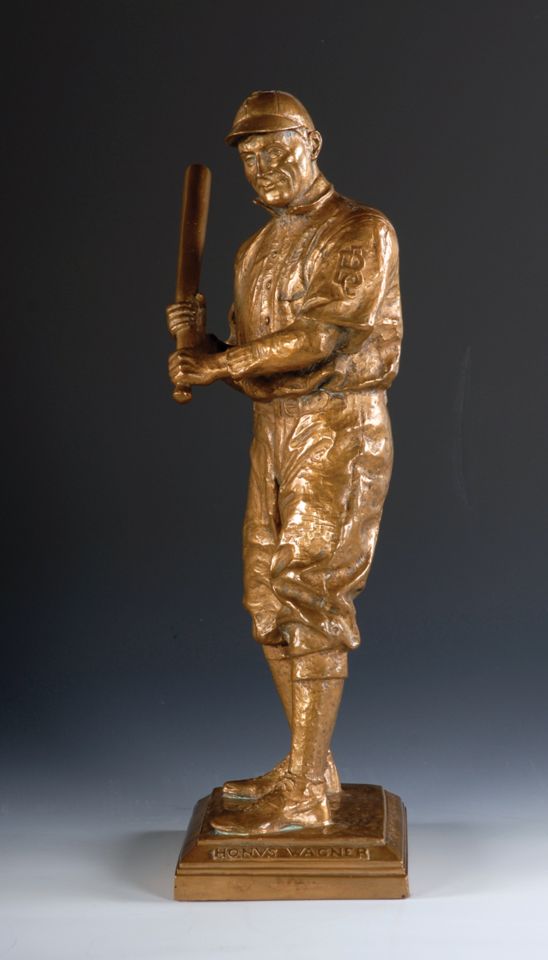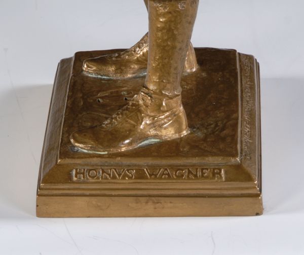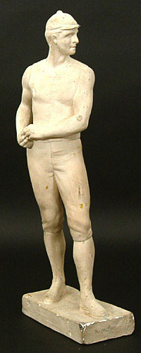StaggPrattStatue.jpg (21842 bytes)The last time I saw a never before seen  antique sports statue by a major American sculptor was in the 2005 Robert Edward Auction Lot 651. It was  of Amos Alonzo Stagg, sculpted by Bella Pratt, also of Boston by the way. That one was 19 inches tall and cast in plaster. It was a very great exciting work particularly because it was done by Pratt while he was a 20 year old student at Yale. Great piece, but it's kind of in the minors compared to the Wagner. The Wagner is definitely in the majors...it's serious art!