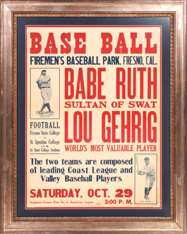 I think I've only seen this incredible poster offered once or twice but can't recall which auction houses. From the first time I saw one of these many years ago, it's been one of my favorite all time sports display pieces! I vaguely recall a conversation about it with someone, and was told a big celebrity had intended to bid on it but forgot....Dustin Hoffman or Billy Crystal...one of the two I think it was. The printing in red and blue really make this poster sing. It's interesting the message of the poster doesn't mention the names of the teams, the Bustin’ Babes and Larrupin’ Lous, or that it was a barnstorming tour. Matter fact,  as advertising messages on posters go...it's a little vague. I guess Ruth and Gerhig's coming was so well known and anticipated in the Fresno area, the poster didn't need to say too much. The Bustin’ Babes and Larrupin’ Lous traveled the country playing exhibition games. They played in 21 cities in 1927, the year of this poster. So you figure BustinBabesHat - Copy.jpg (709259 bytes) there has to be more posters of the tour out there. But I doubt any would look this good. Legendary did a great write up which included details with names of the local players who took part....it's a real good read. Back in 2008 Heritage auctioned an original baseball cap from the Bustin Babes for $131,450.00....I'd rather have this poster any day...I wonder what it'll go for? I was at a National once and a guy was selling reproductions of either this poster or another poster from the tour, for $300.00 each....They weren't the usual edgy quality of the fakes you see on eBay,,,,looked real good, but I couldn't get past having a repro even if it was great.