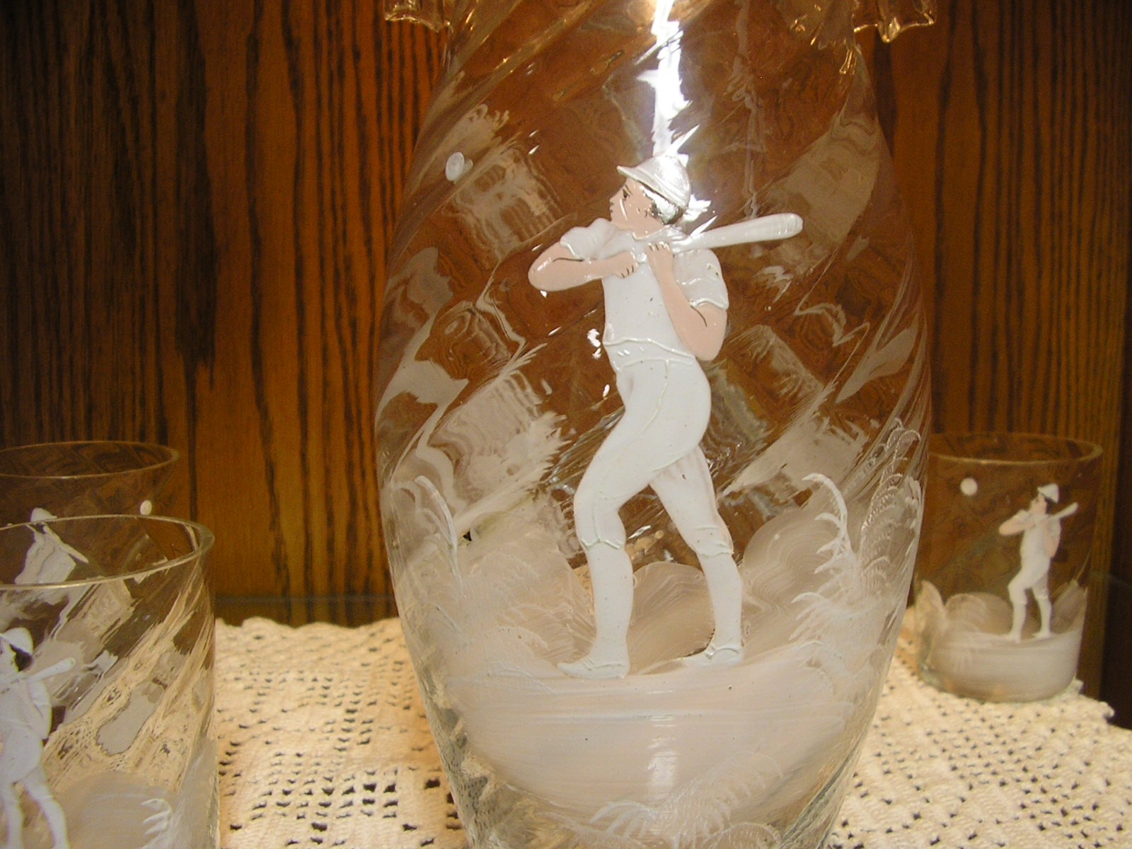 carlton, im sending photos of a hand painted glass lemonaide set from 1880 to1890s. this was known as mary gregory glass or bohemian glass from europe, not sure if its american. can you see if anyone has ever seen anything like it. its missing one glass since there were 3 left and 3 right handed batters. it is in remarkable cond. there isnt a chip on any of the pieces ,and its amazing that it was never broken. thanks kevin. |