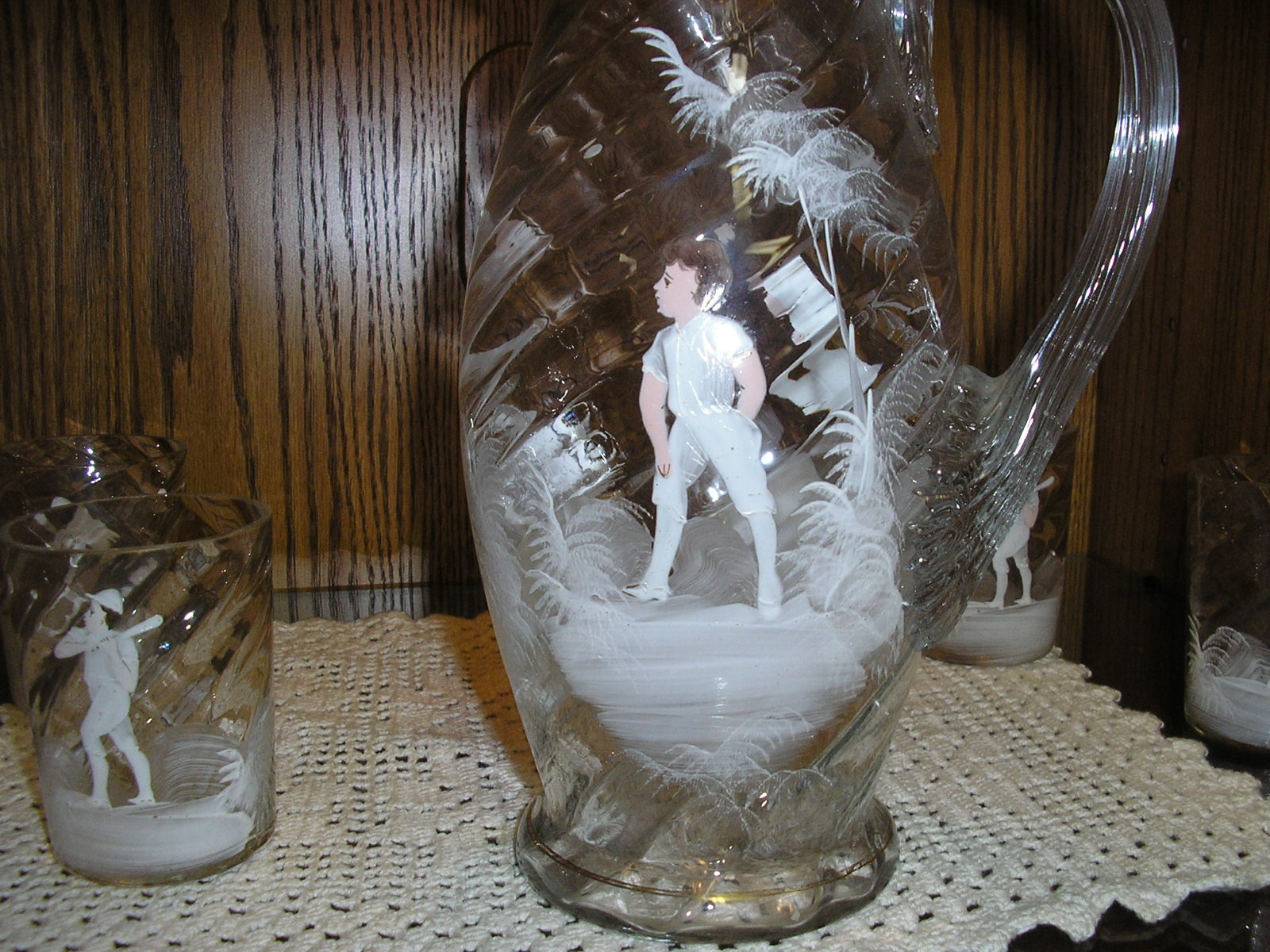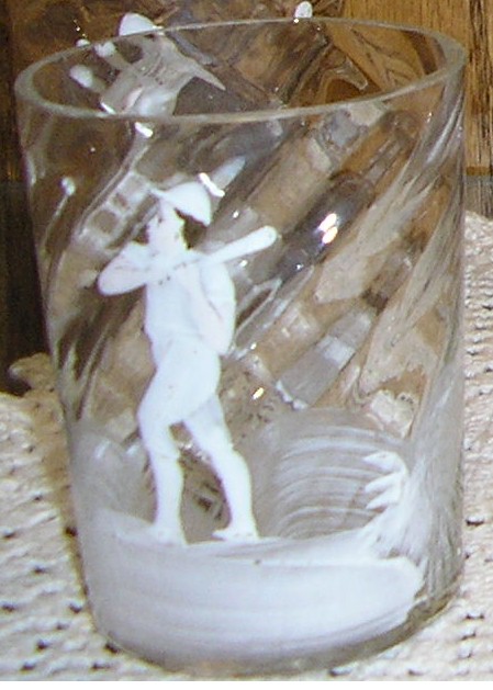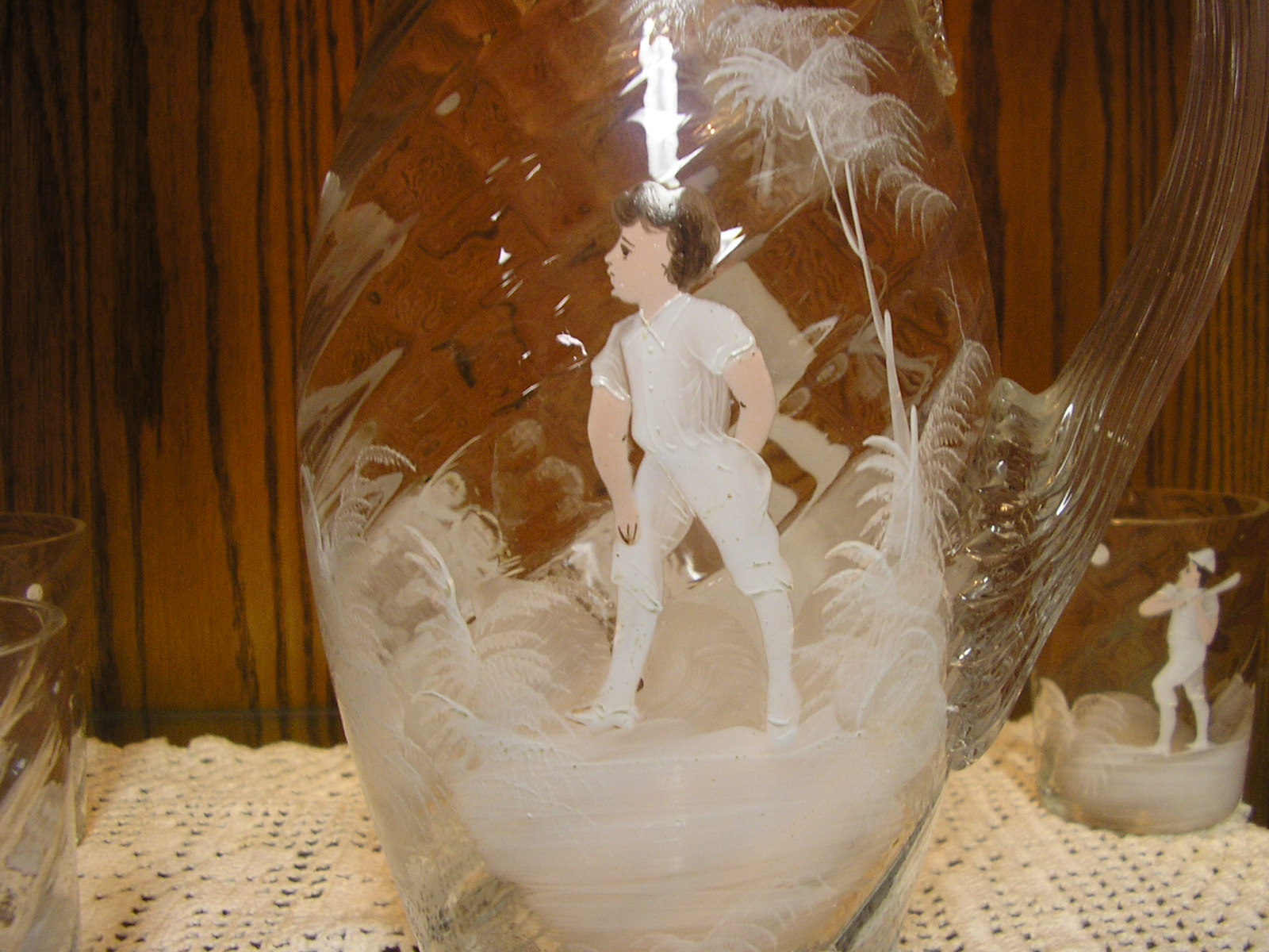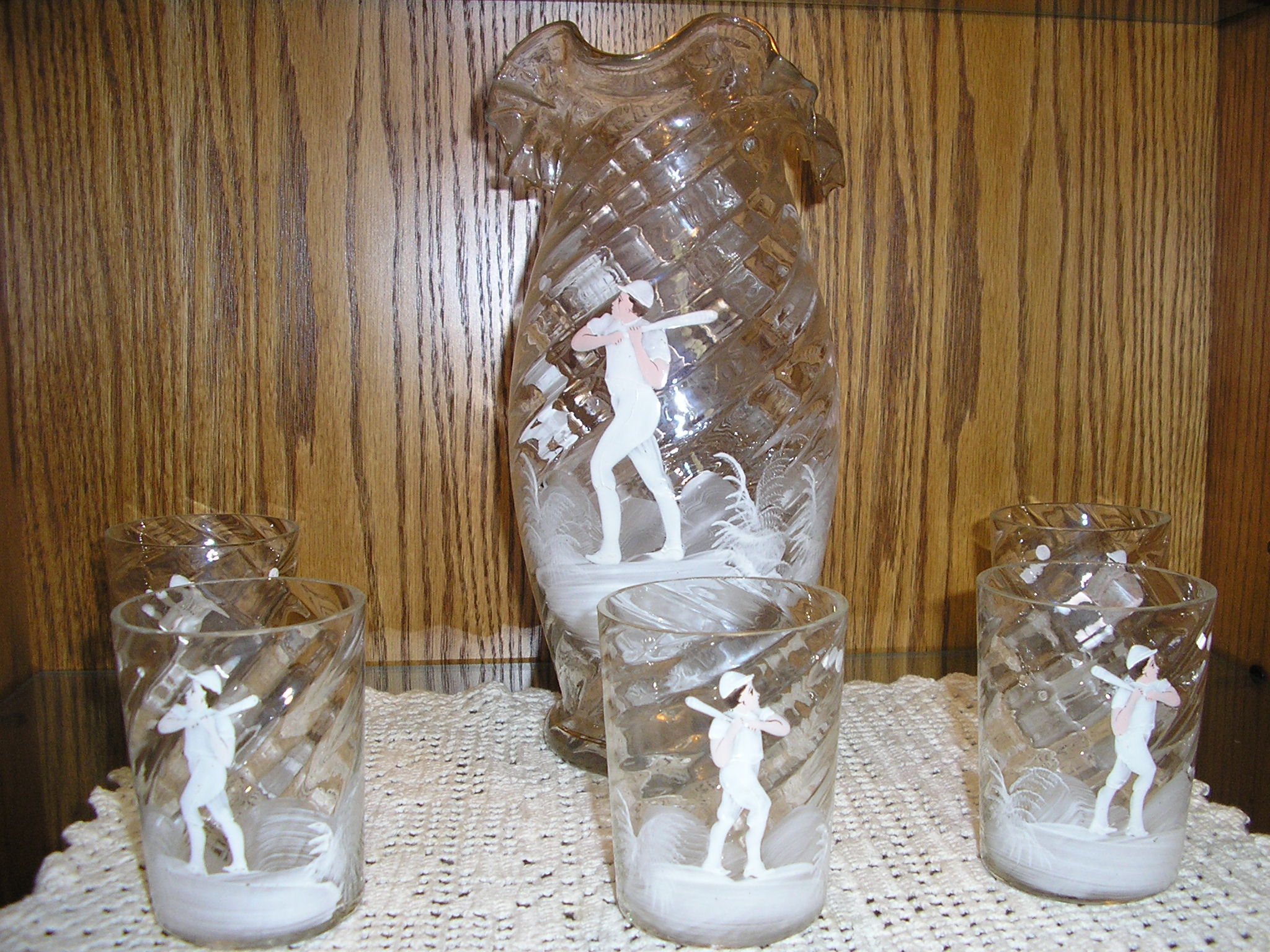 carlton ,i had a chance years ago, probably 10 years to buy this set for 700 dollars which i thought was a steal, and i couldnt afford it at the time from a dealer i know. well i stopped at his house where they had this set in there antique collection and i asked figuring it was long gone and woudnt you know it they still had it, and he said it was 700 dollars 10 years later and i bought it. it doesnt have a makers mark on it . all i know its either american or bohemian. it is known as mary gregory glass because of the ferns painted around the figures. if you google mary gregory glass you'll see what i mean. the people i got it from new it was worth alot more but knew i was a sports collector. to me it is a stunning hand painted glass set and flawless. thanks |