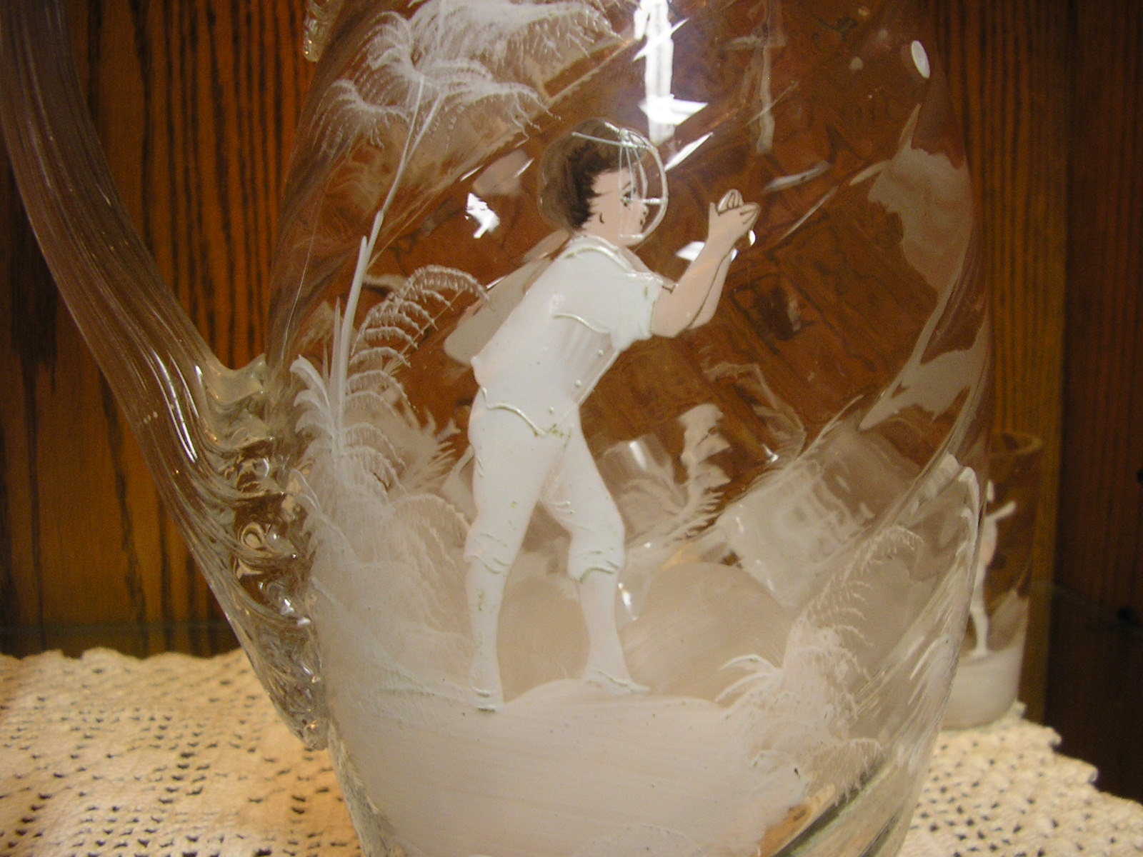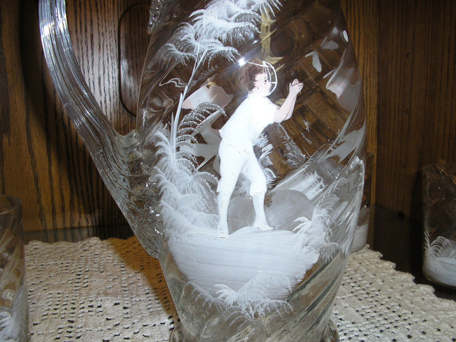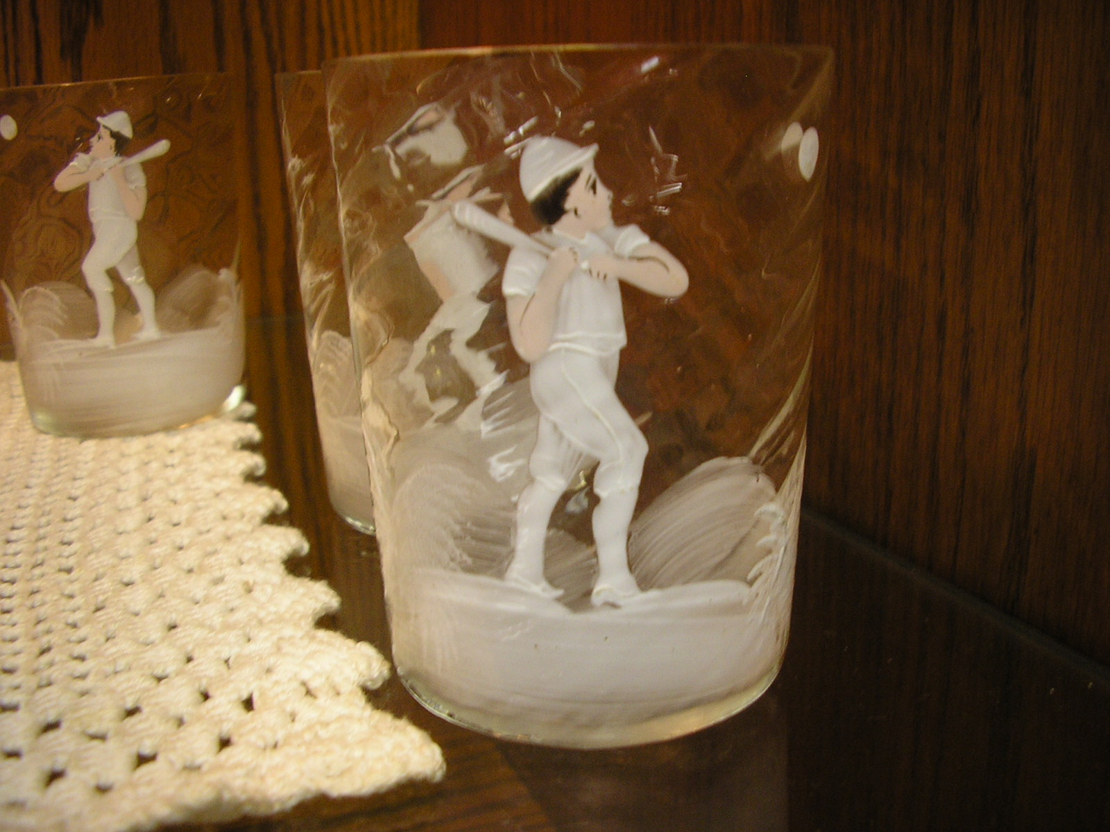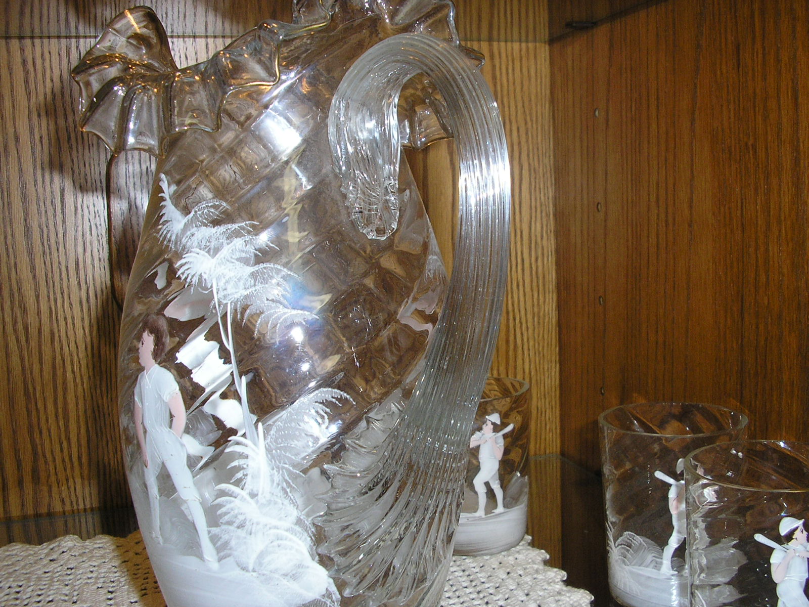 carlton ,i had a chance years ago, probably 10 years to buy this set for 700 dollars which i thought was a steal, and i couldnt afford it at the time from a dealer i know. well i stopped at his house where they had this set in there antique collection and i asked figuring it was long gone and woudnt you know it they still had it, and he said it was 700 dollars 10 years later and i bought it. it doesnt have a makers mark on it . all i know its either american or bohemian. it is known as mary gregory glass because of the ferns painted around the figures. if you google mary gregory glass you'll see what i mean. the people i got it from new it was worth alot more but knew i was a sports collector. to me it is a stunning hand painted glass set and flawless. thanks |