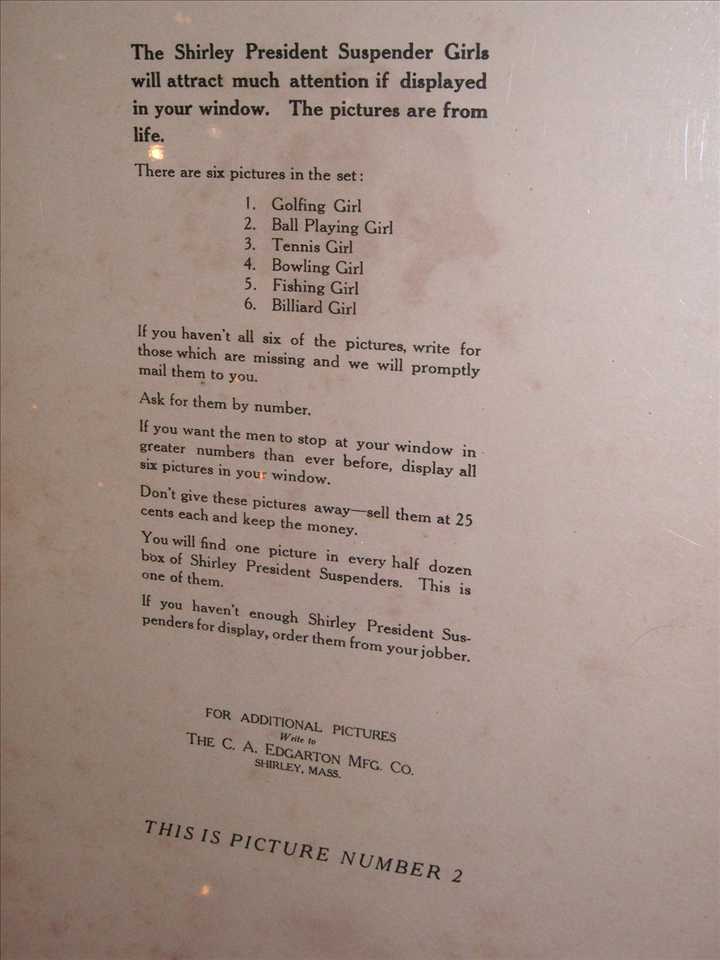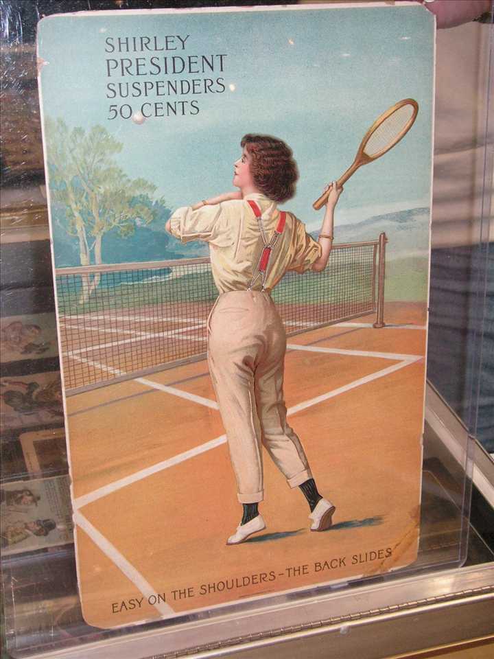 Next was one of the best things I saw at the show, a set of four c1900 advertising posters for the Shirley President Suspenders Company. All the posters featured young ladies participating in different sports. There was one for tennis , fishing , baseball , and bowling. According to the back of them there was also a Billiard Girl, and a Golfing Girl that Glen didn't have. Each was 13 1/2" tall x 8 1/2" wide, $12,000.00 for the set of four.